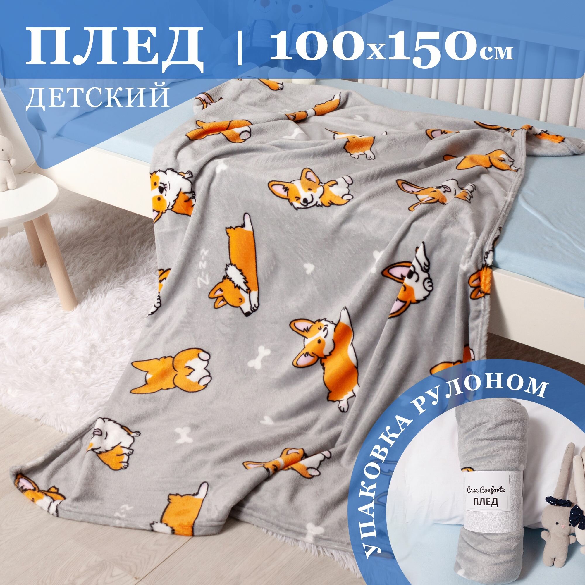 Плед велсофт детский 100х150 см Casa Conforte Фестиваль, корги / светло-серый