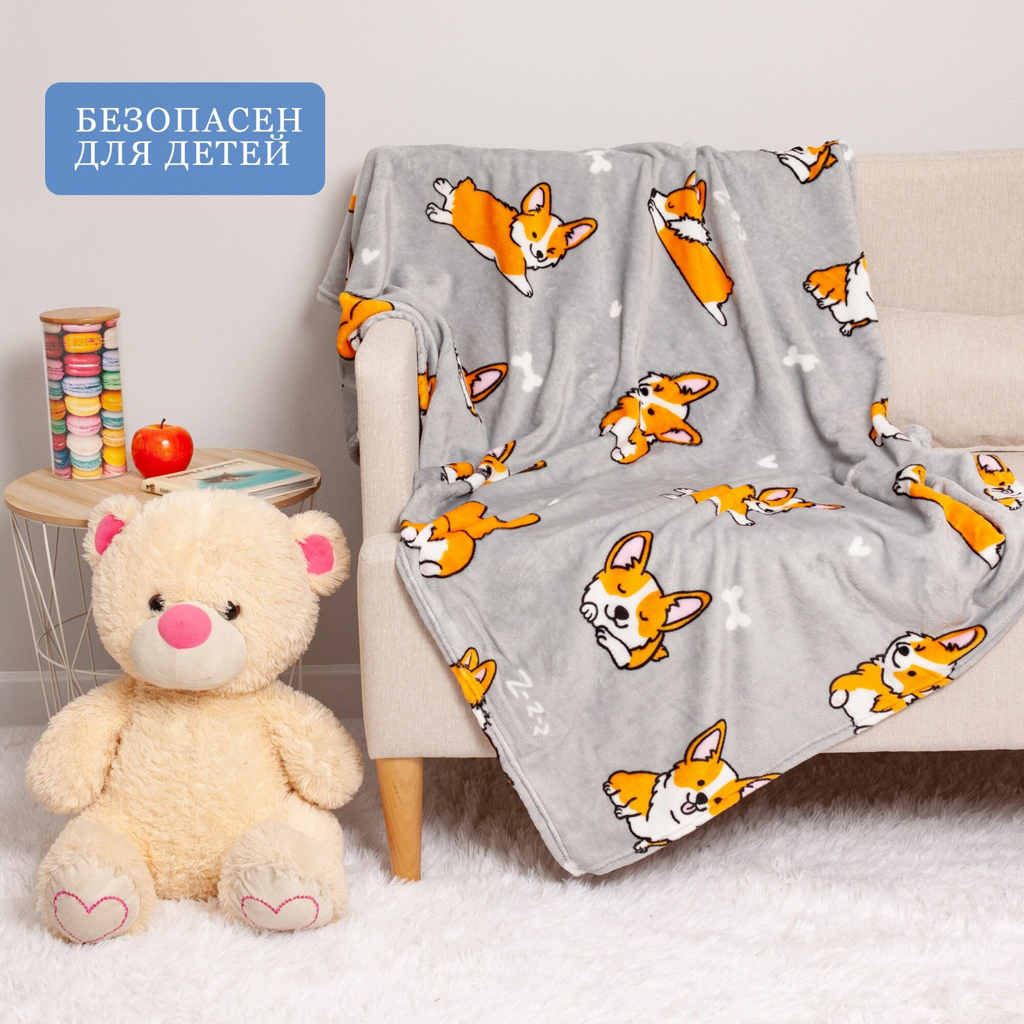 Детский плед из микрофибры, 100 х 150 см, рисунок собачки корги, серый