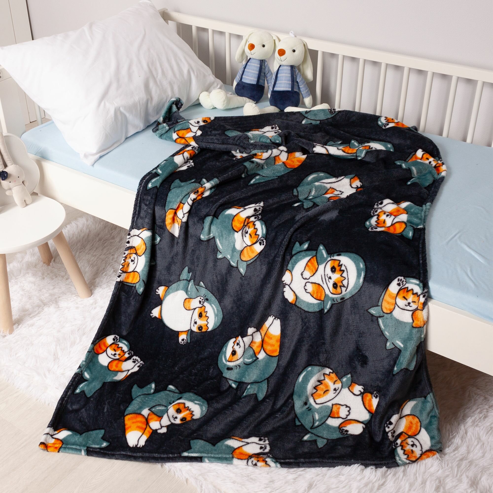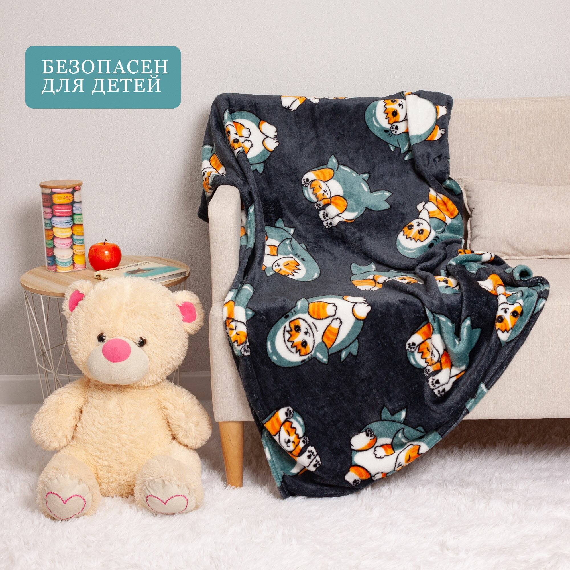 Детский плед из микрофибры с рисунком кот-акула, 150х200 см, серый
