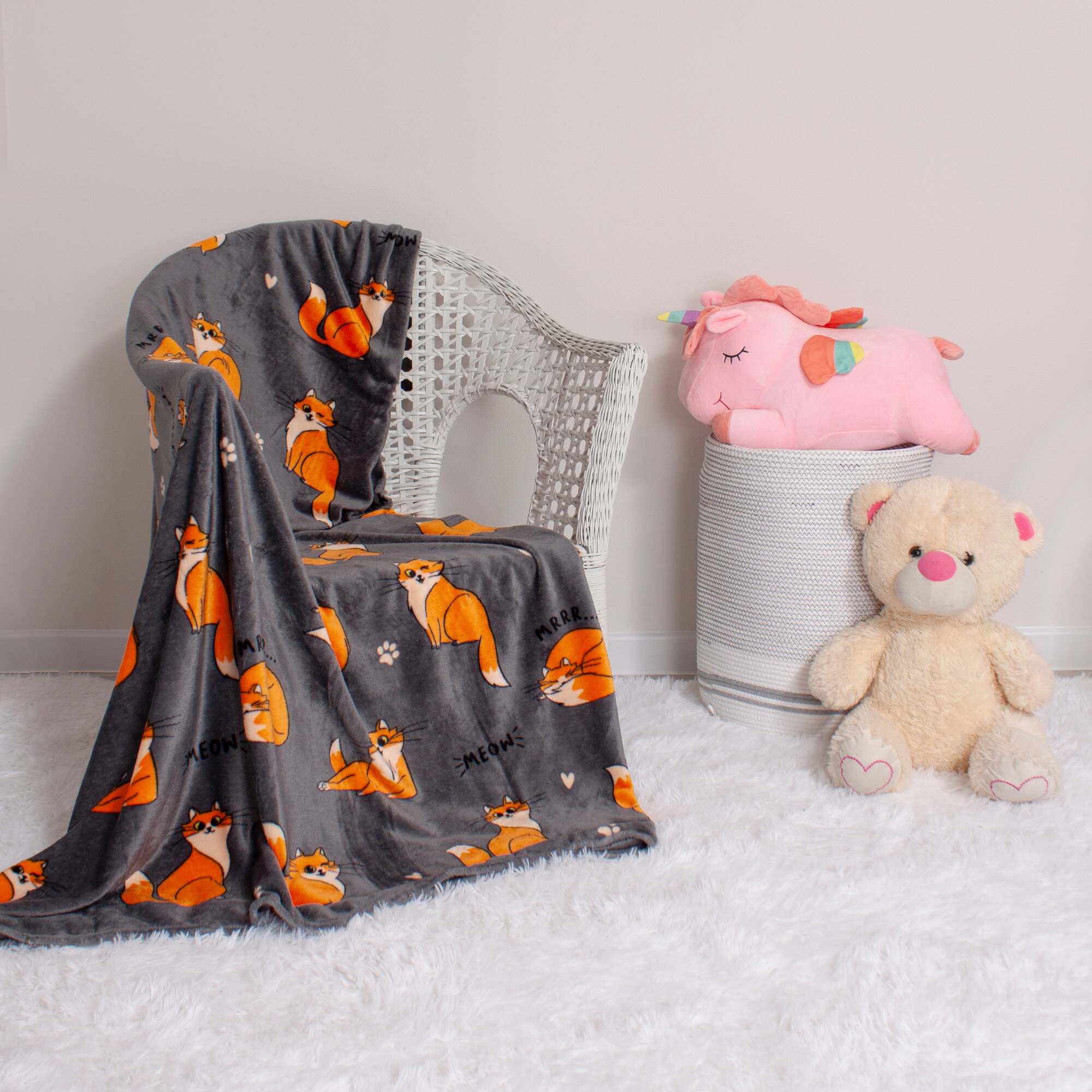 Детский плед из микрофибры, 100 х 150 см, рисунок собачки корги, серый
