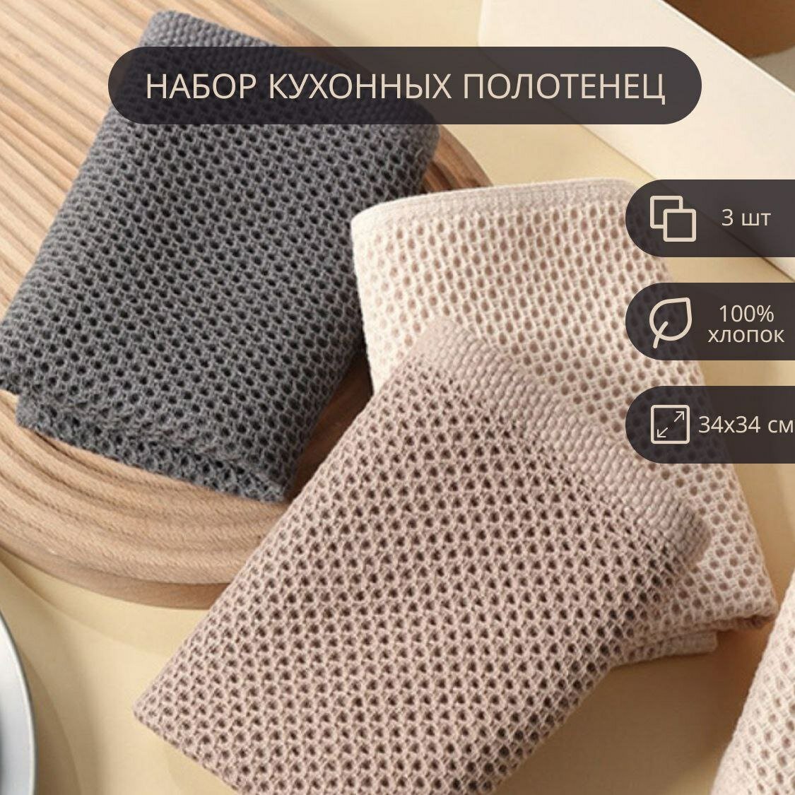 Набор кухонных полотенец из 100 % хлопка, 3 шт, размер 34 х 34
