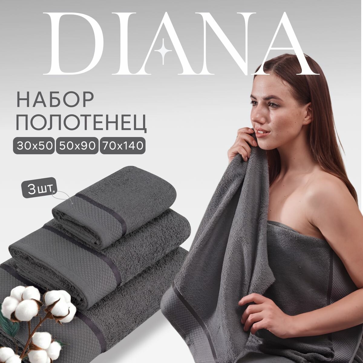 Полотенце махровое 3 шт, 30х50, 50х90, 70х140, Diana, Нуар, цвет: Грей