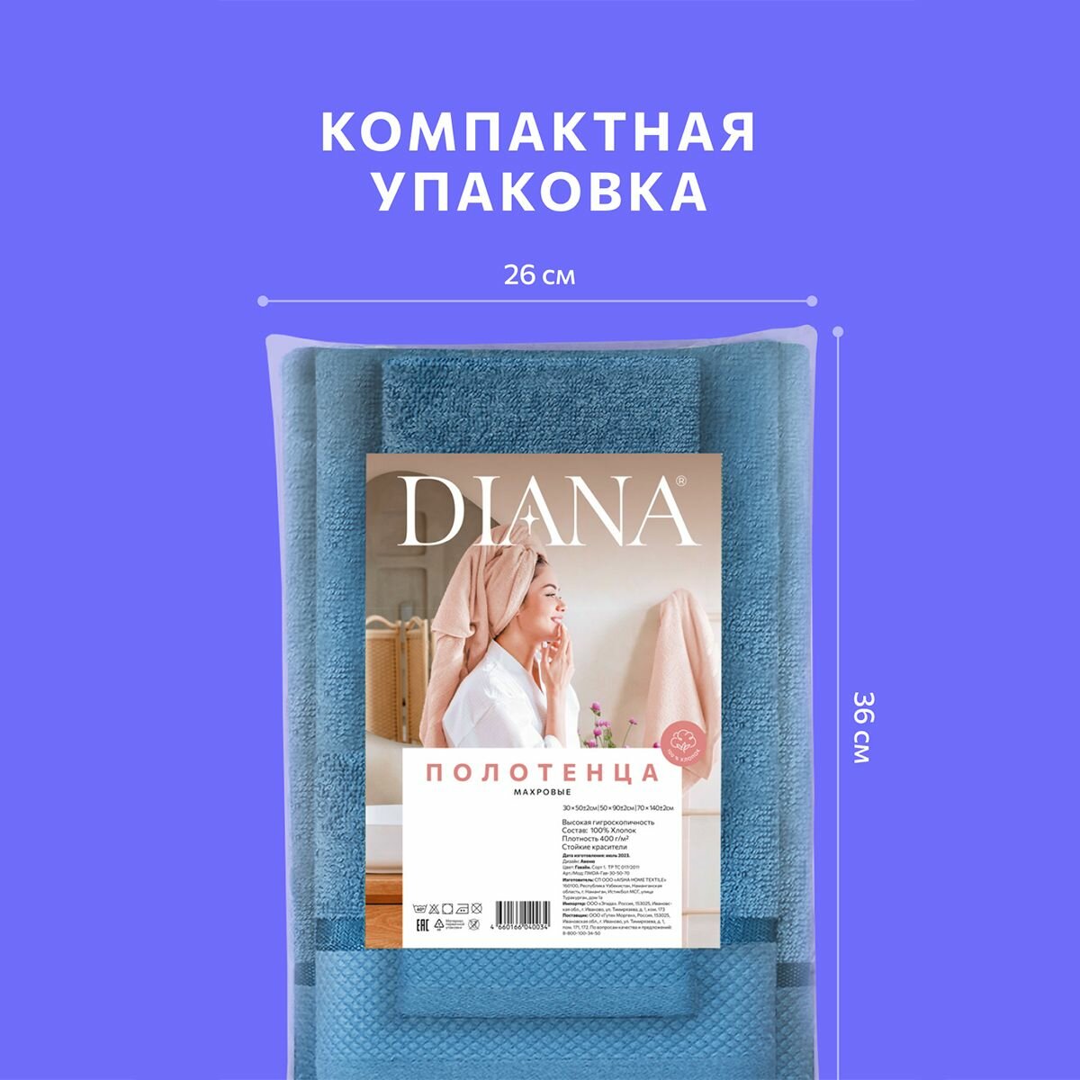 СохранитьПолотенце махровое 3 шт, 30х50, 50х90, 70х140, Diana, Нуар, цвет: Индиго интересное: