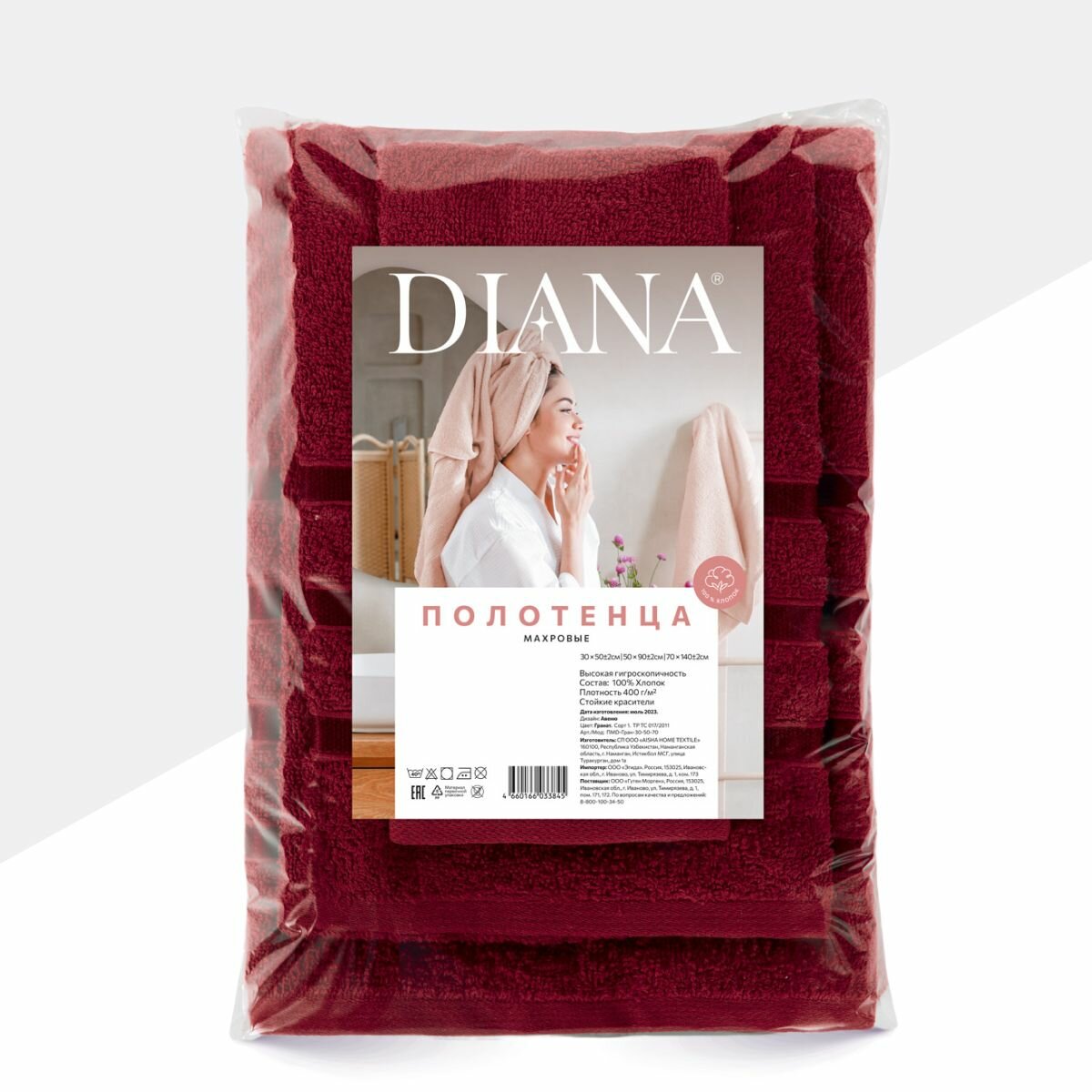 Полотенце махровое 3 шт, 30х50, 50х90, 70х140, Diana, Нуар, цвет: Винный