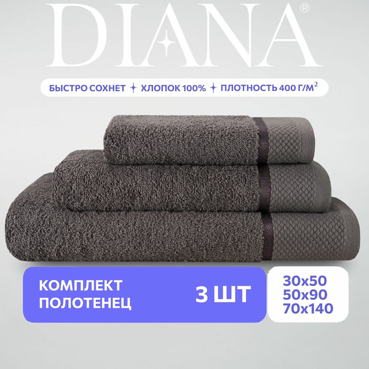 Полотенце махровое 3 шт, 30х50, 50х90, 70х140, Diana, Нуар, цвет: Грей интересное: