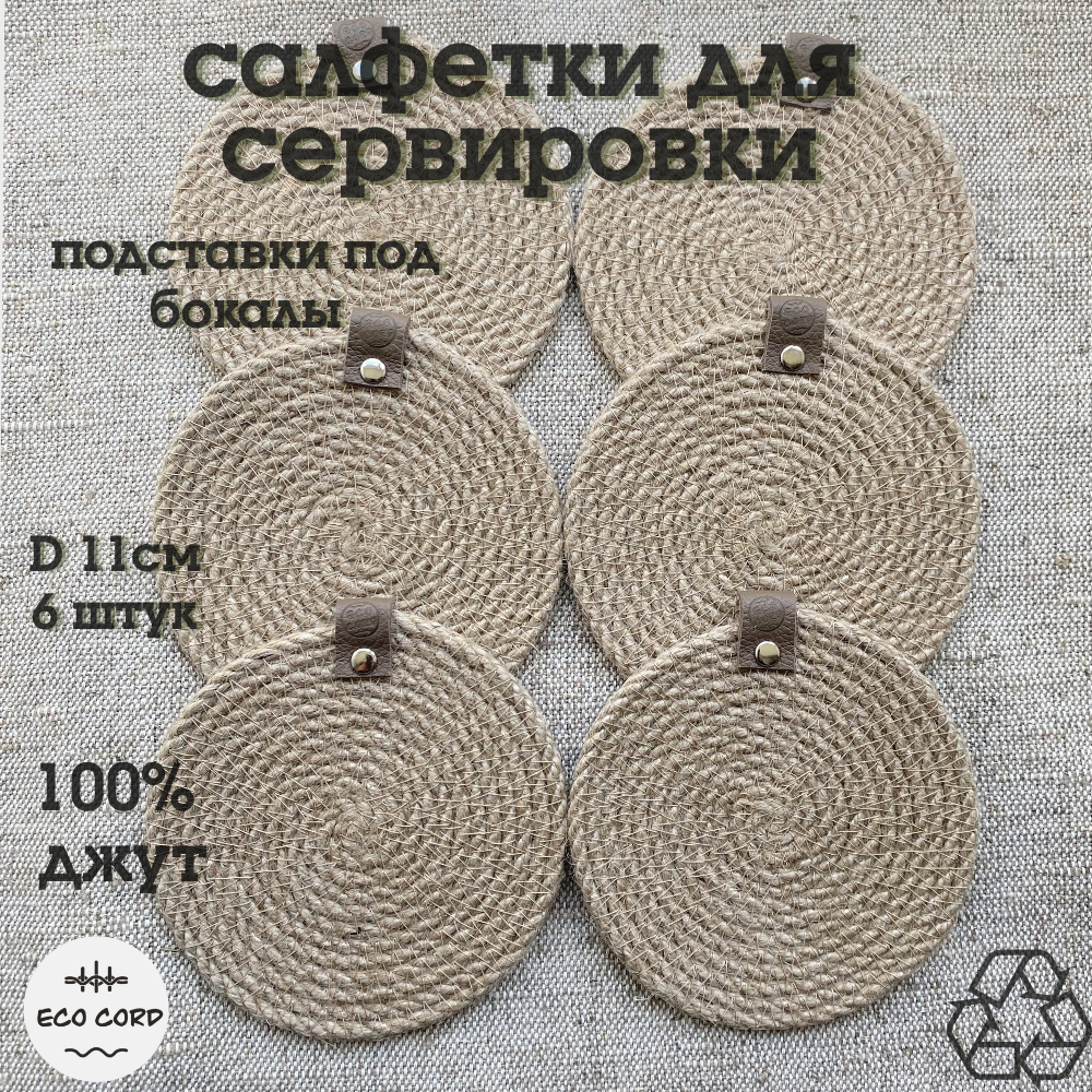 Салфетки на стол, подставка под бокал из джута 6 шт, 11 см, Eco Cord