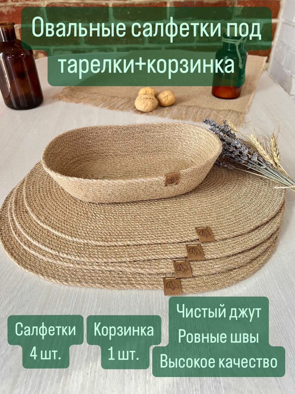 Купить Сервировочные овальные салфетка из джута, 4 шт. + корзинка для хлеба