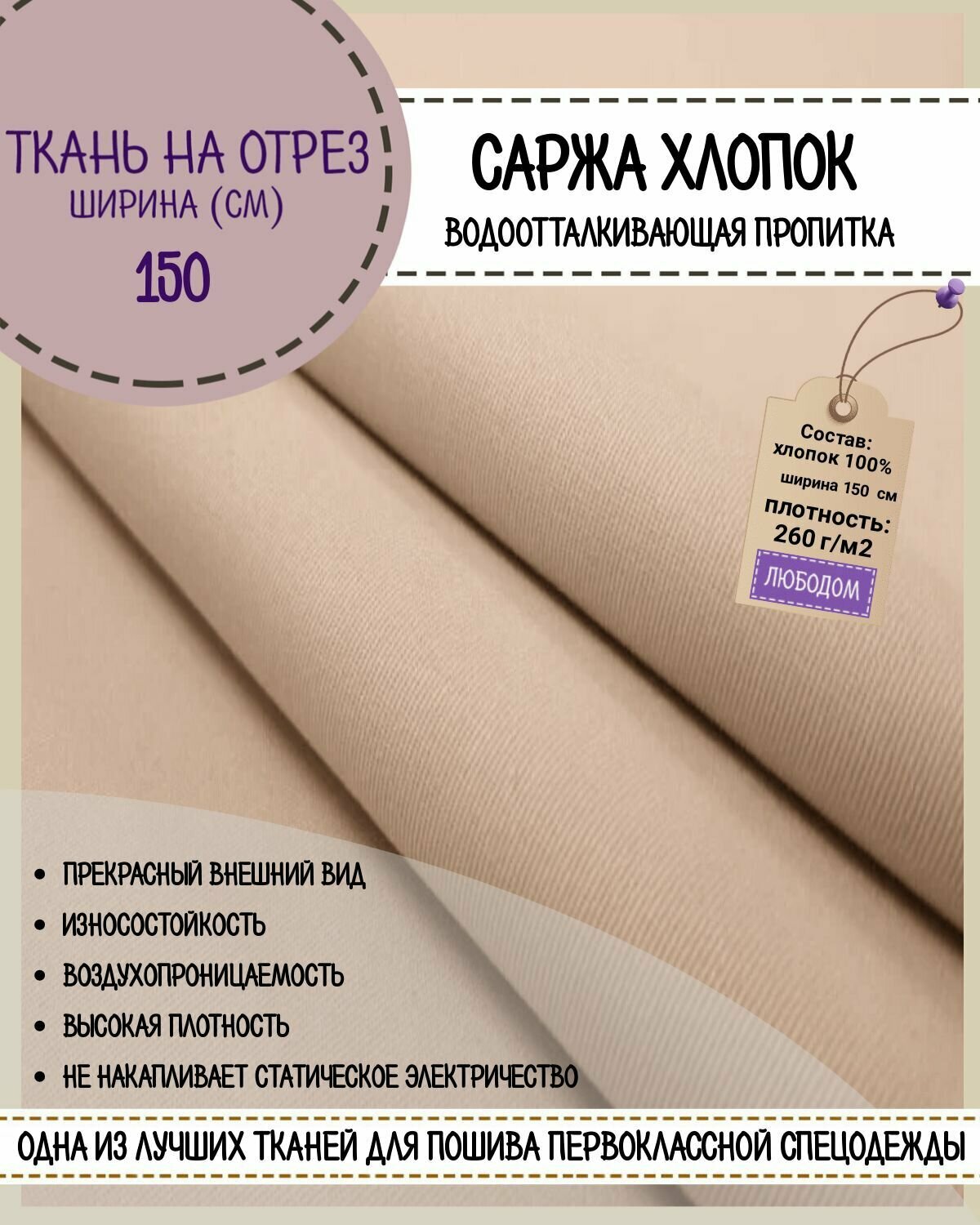 Ниже Вы можете прочитать отзывы на ткань Саржа с влагоотталкивающей пропиткой, 100% хлопок, плотность 260 гр/м2, ширина 150 см, цвет светло-бежевый, на отрез, цена указана 1 пог. метр, ознакомится с подробными характеристиками, посмотреть интересные обзоры и фотографии на ткань Саржа с влагоотталкивающей пропиткой, 100% хлопок, плотность 260 гр/м2, ширина 150 см, цвет светло-бежевый, на отрез, цена указана 1 пог. метр.