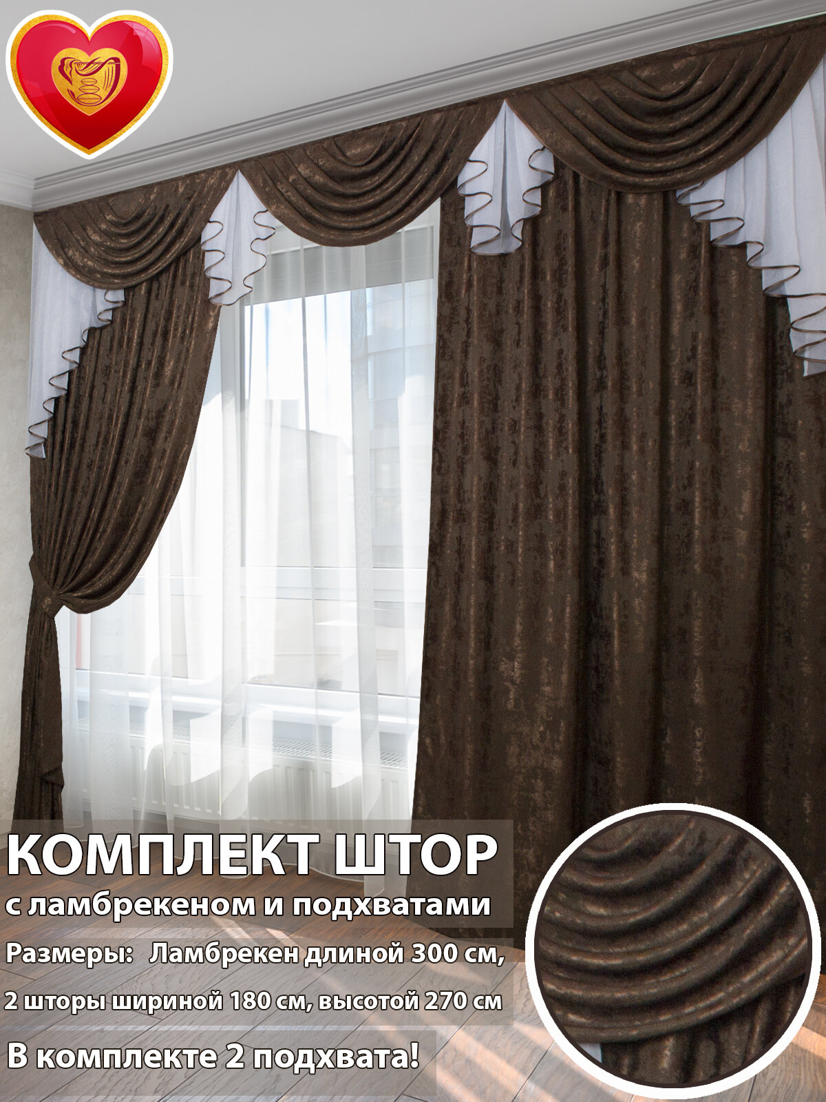 Купить Шторы интерьерные с ламбрекеном и подхватами Графиня шоколад