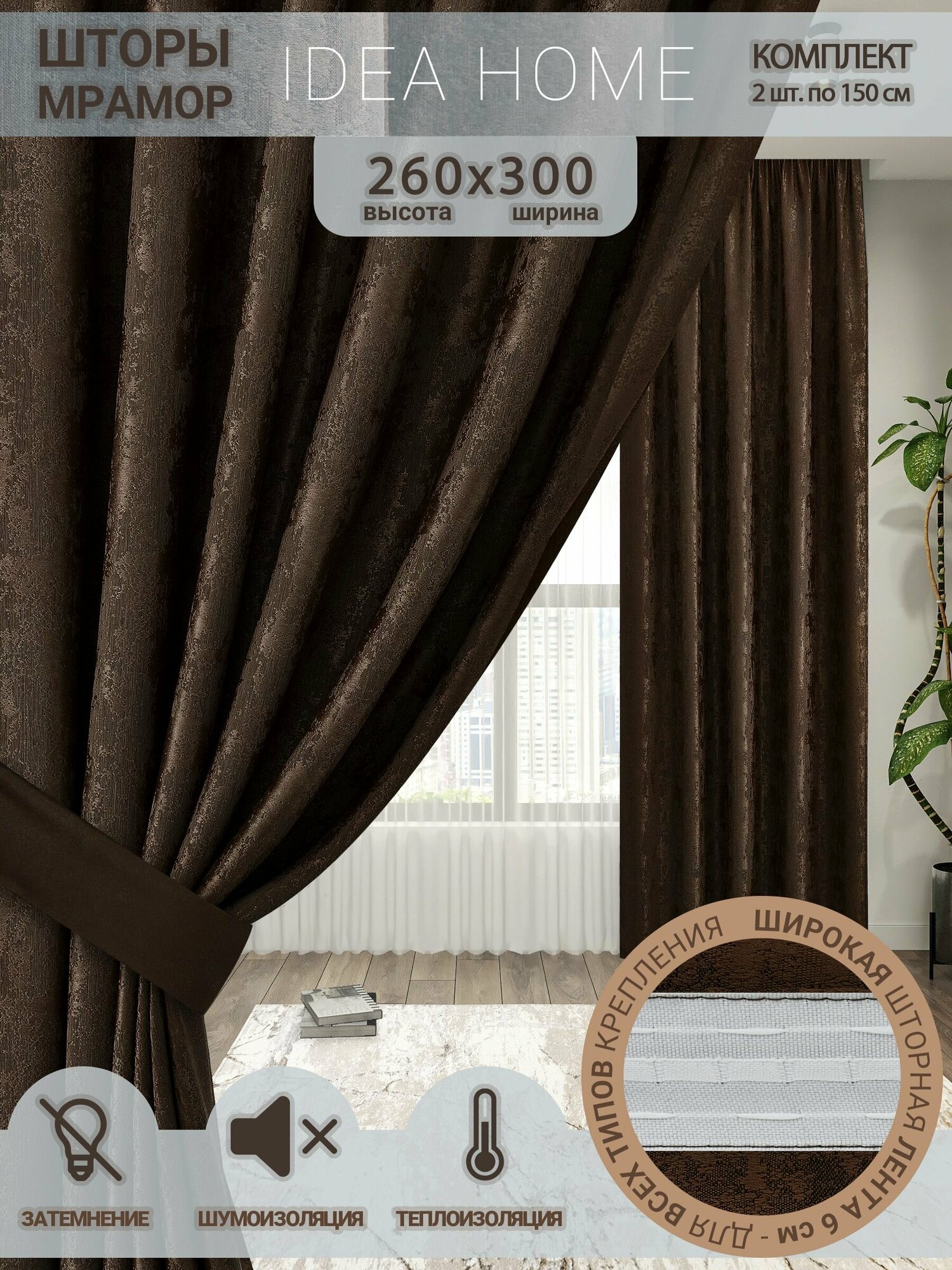 Шторы комнатные IDEA HOME портьеры для комнаты, кухни, спальни, гостиной и дачи 270х300см, коричневый мрамор