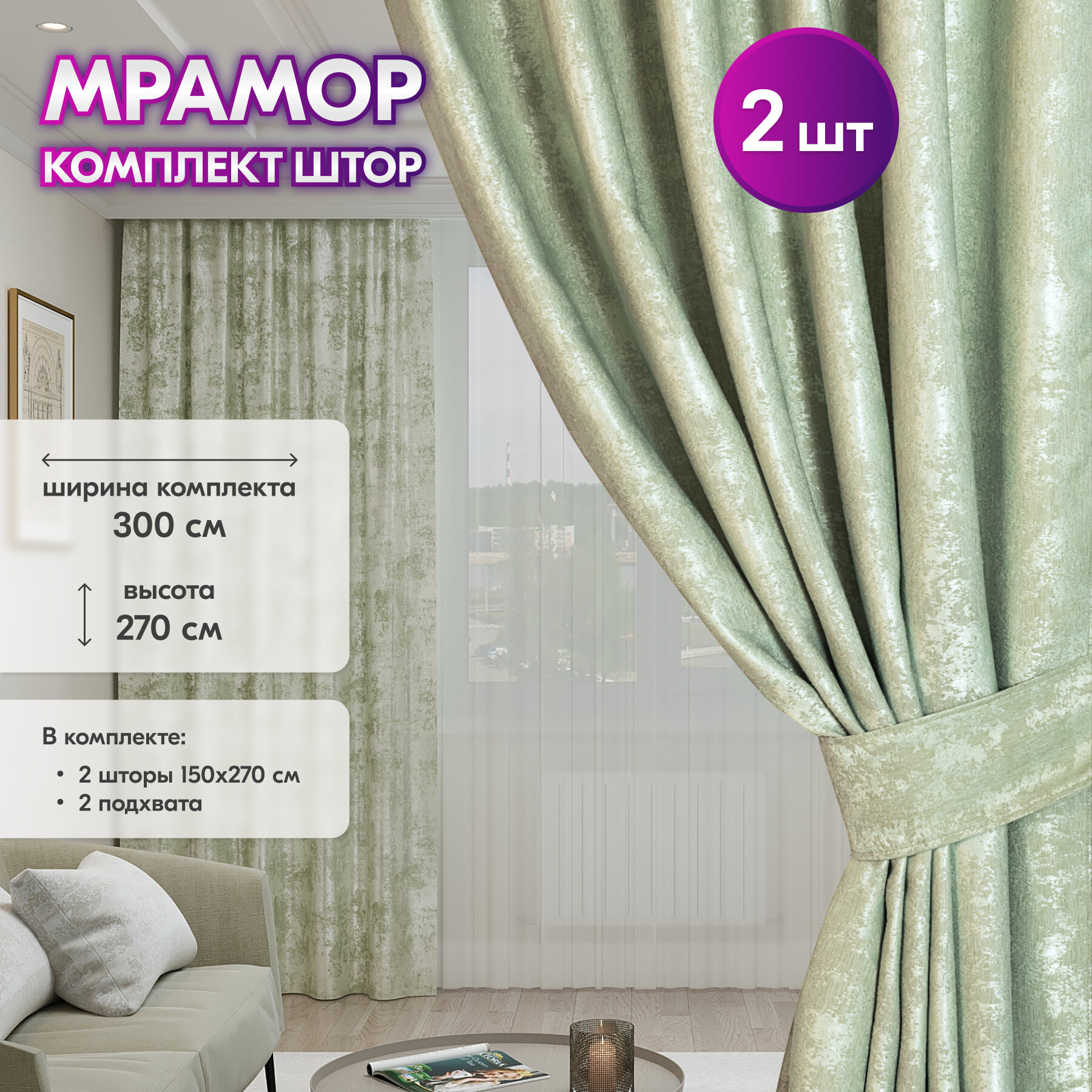 Комплект штор для гостиной Мрамор 150х270 см, с подхватами, зеленый. интересное: