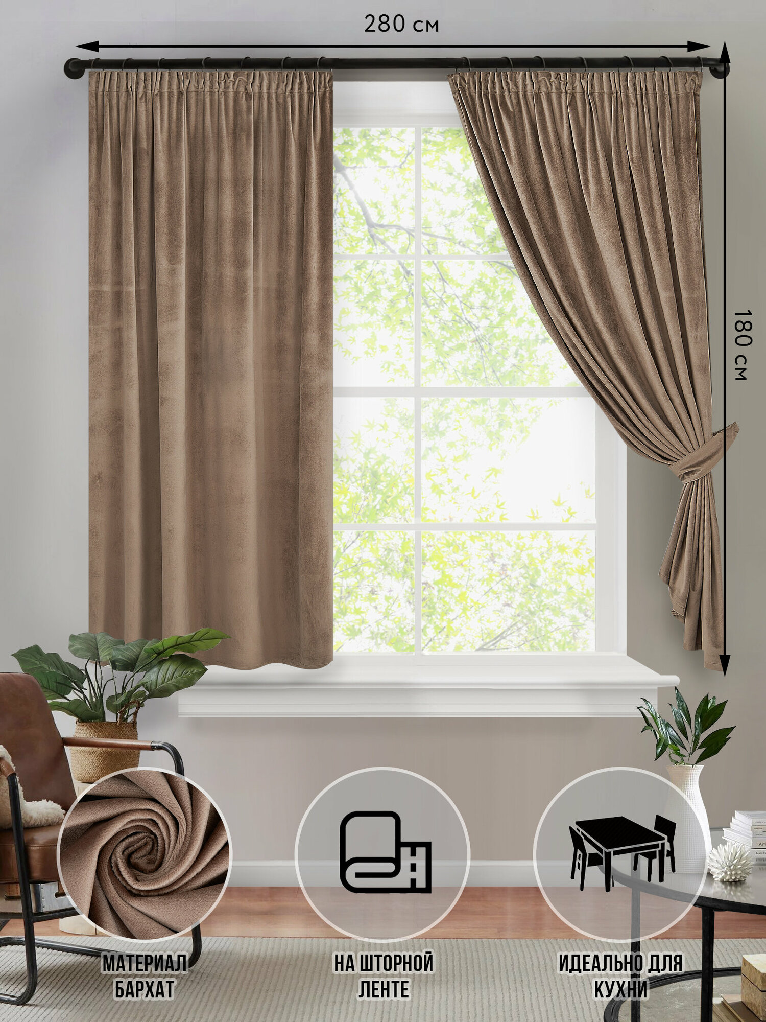 Шторы короткие плотные SvAlMi бархат темно-коричневый для кухни спальни детской