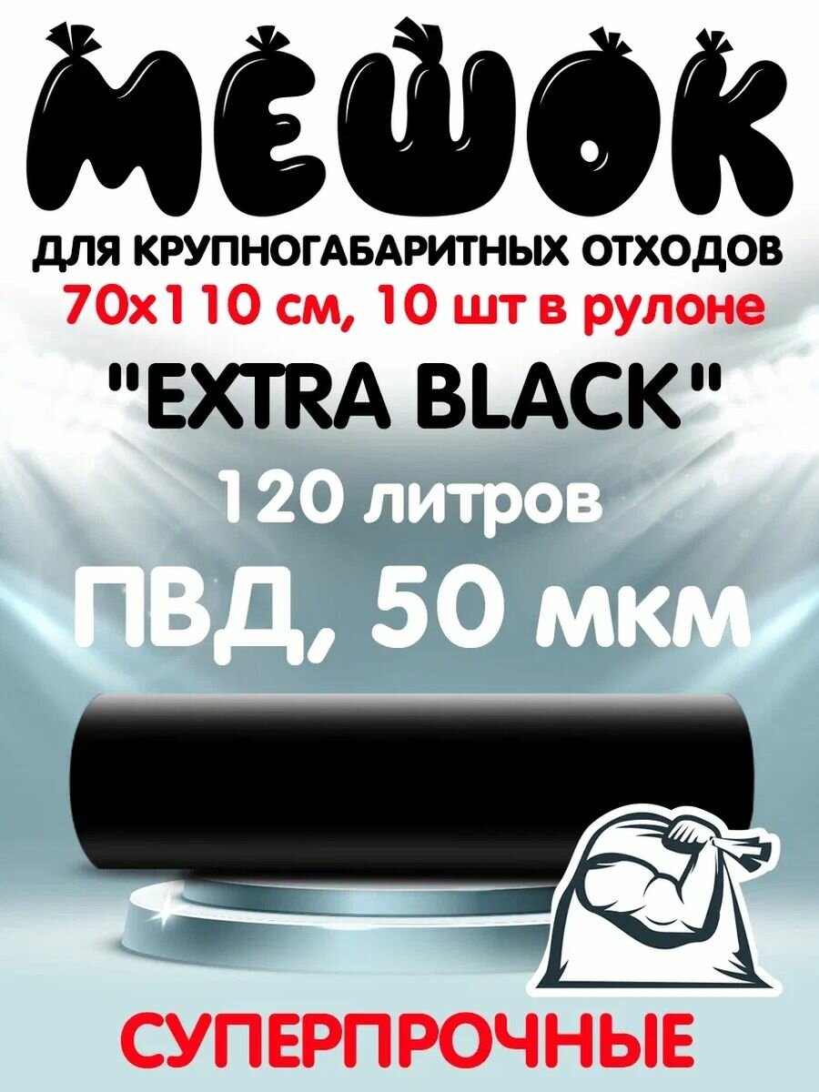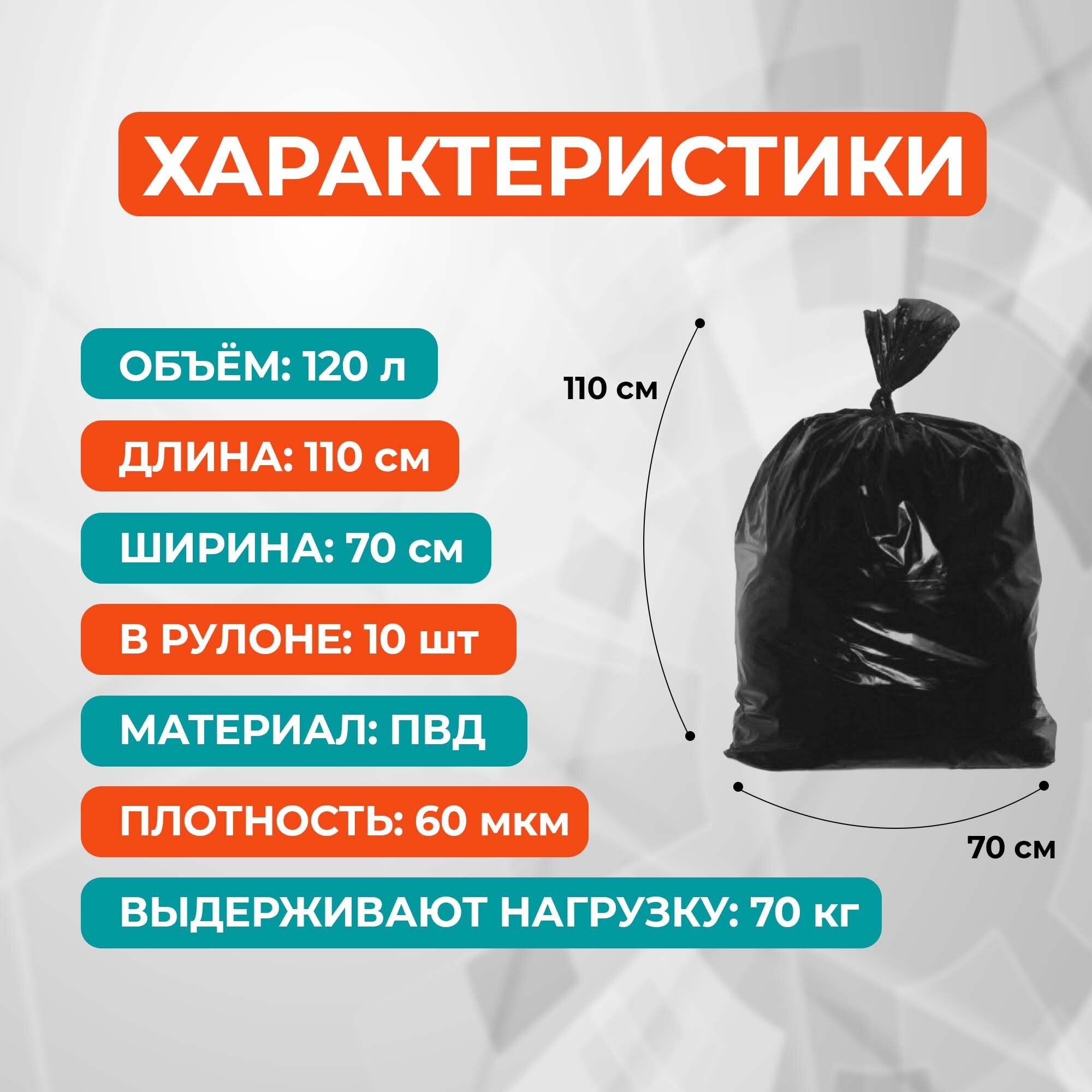 Мега прочные пакеты для мусора 120 л, размер 110x70, черные 1 рулон (10 шт), 60 мкм