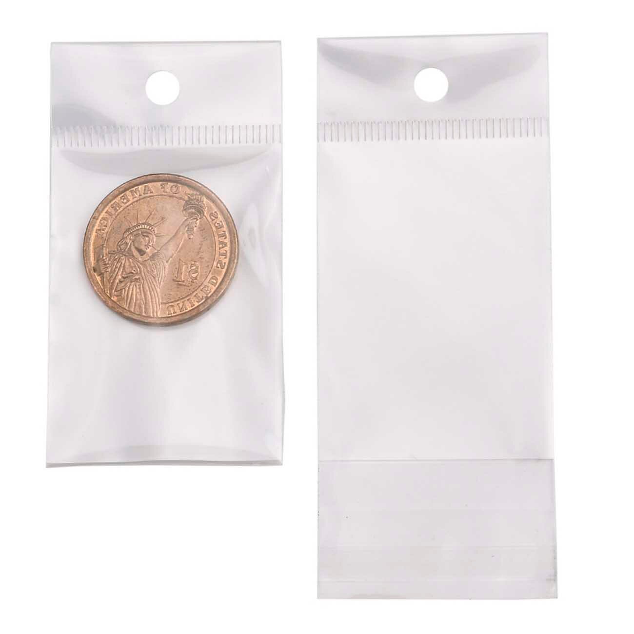 500 пакетов 5х8+5 см с белым подвесом и клеевым клапаном для упаковки из прозрачной пленки бопп