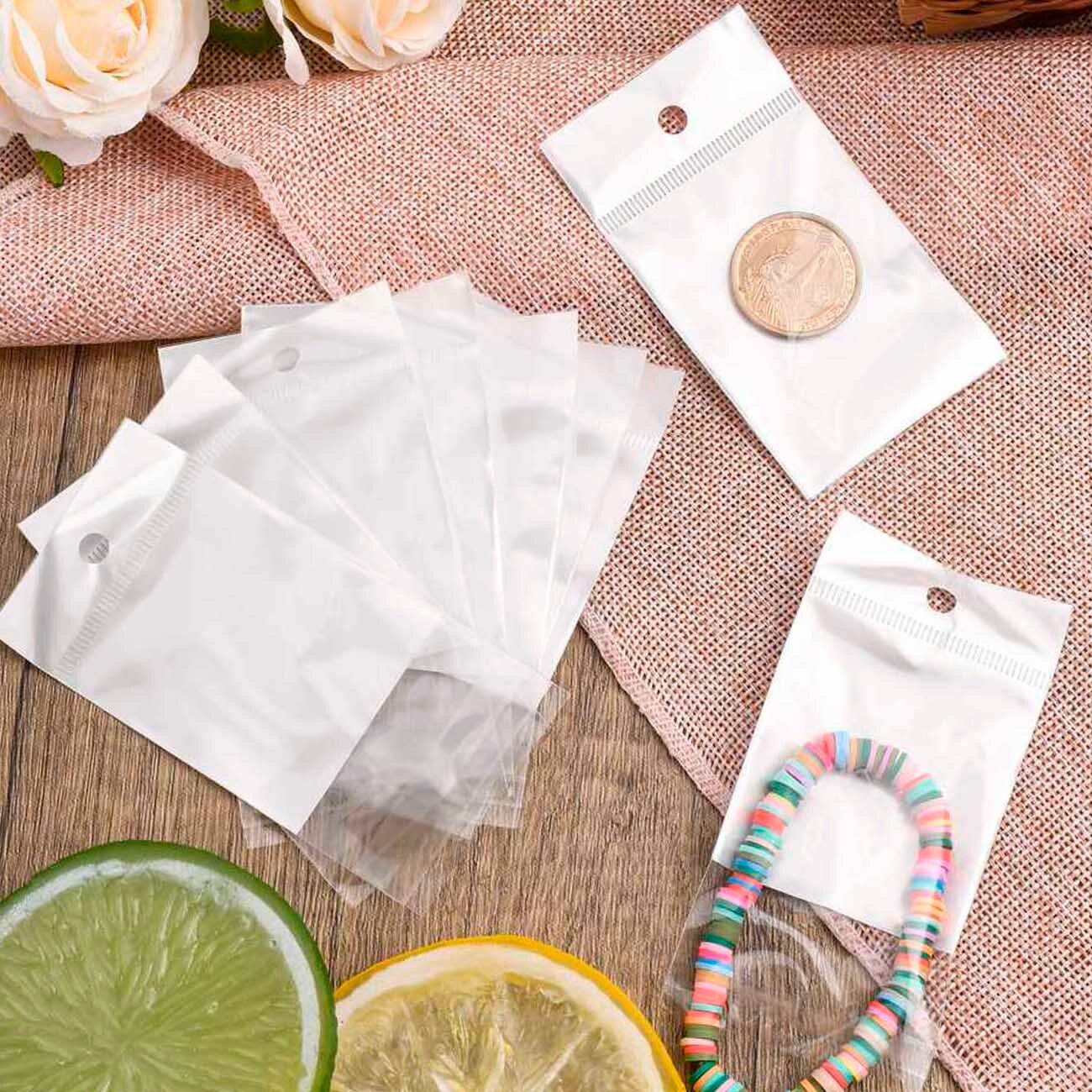 500 пакетов 7х7+4 см с подвесом, клеевым клапаном, белым фоном для упаковки из прозрачной пленки БОПП