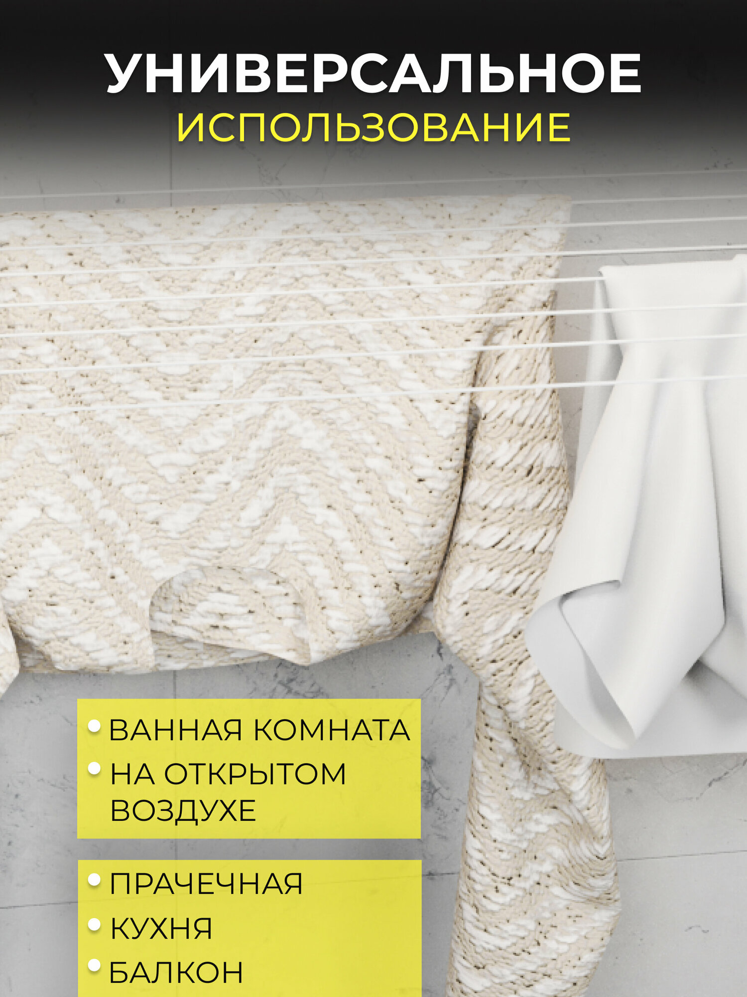 | Комплектация | кронштейн 2 шт; саморезы 4 шт: заглушки 4 шт; дюбель гвозди 4 шт; бельевая веревка 2 шт по 10 м; упаковка 1 шт. |