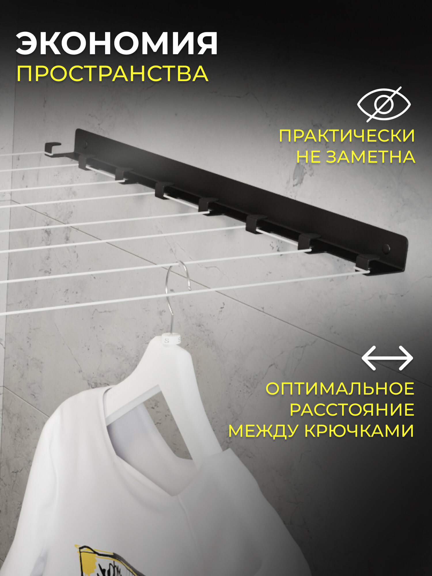 Сушилка для белья настенная, металлическая, на балкон, террасу, в ванную, в дом, для вещей, одеял, черная, 6 струн, 1 шт.