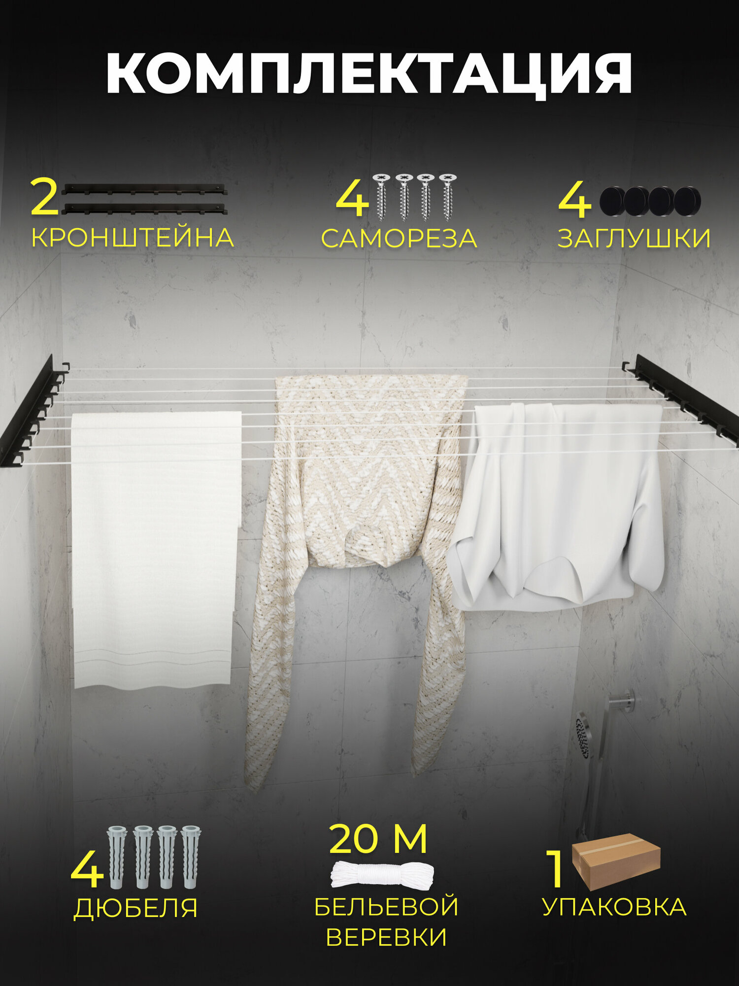 | Комплектация | кронштейн 2 шт; саморезы 4 шт: заглушки 4 шт; дюбель гвозди 4 шт; бельевая веревка 2 шт по 10 м; упаковка 1 шт. |