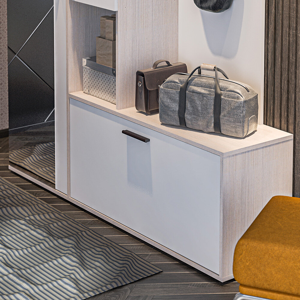 Прихожая столплит Саша СБ-2739 с выдвижной штангой, 12 полок, 3 крючка, ЛДСП, Авиньон/Белый, 150х203х35 см