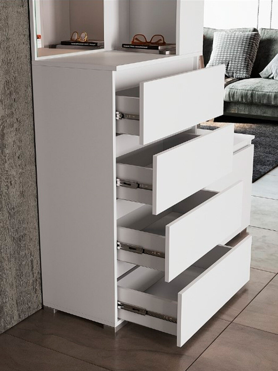 | Состав комплекта | комод с 4 ящиками; тумба с откидной дверцей; вешалка; зеркало 1000х400 мм |
