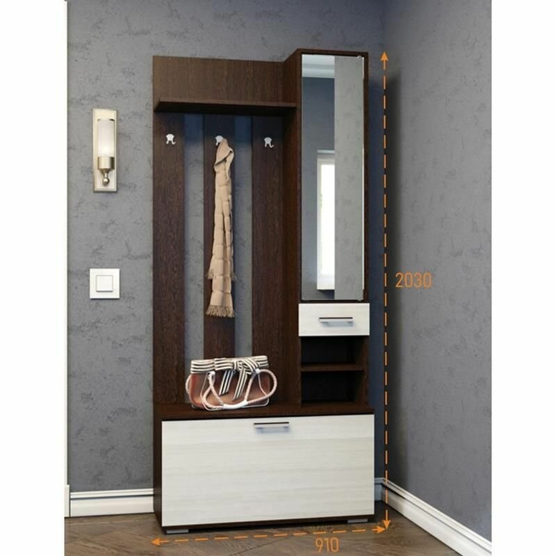 Прихожая комплект САША-6 (правая) от Фант-Мебель, с зеркалом, с обувницей, шкафом и ящиками, 156x203,6x43 см. Ясень темный/Ясень светлый