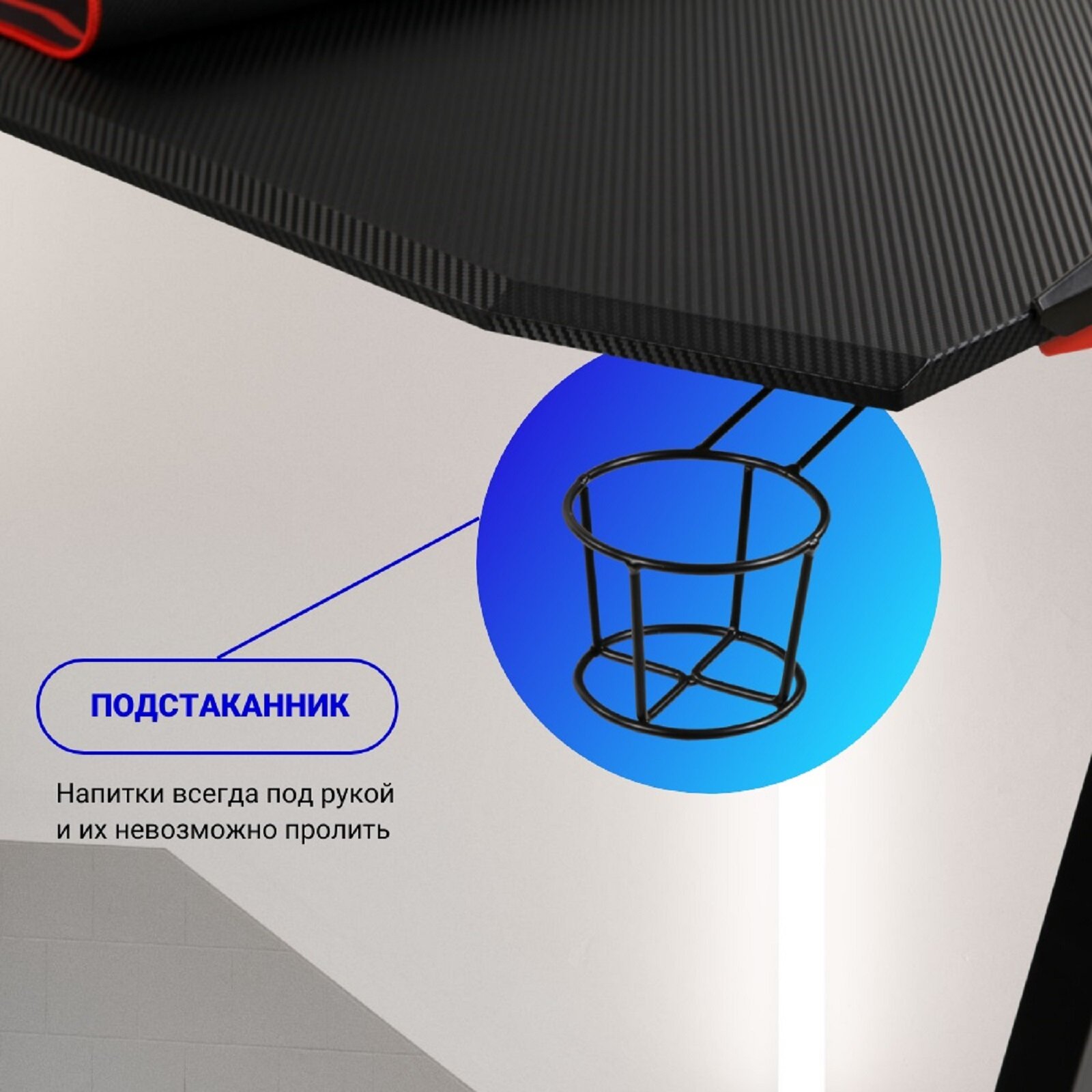 | Дополнительная информация | покрыта столешницы виниловой пленкой с текстурой «Карбон»; цветная подсветка с пультом; подставка под напитки, крючок для вещей и наушников, кабель-канал в столешнице, корзина для блока питания под столешницей; максимальная нагрузка на столешницу – 80 кг |