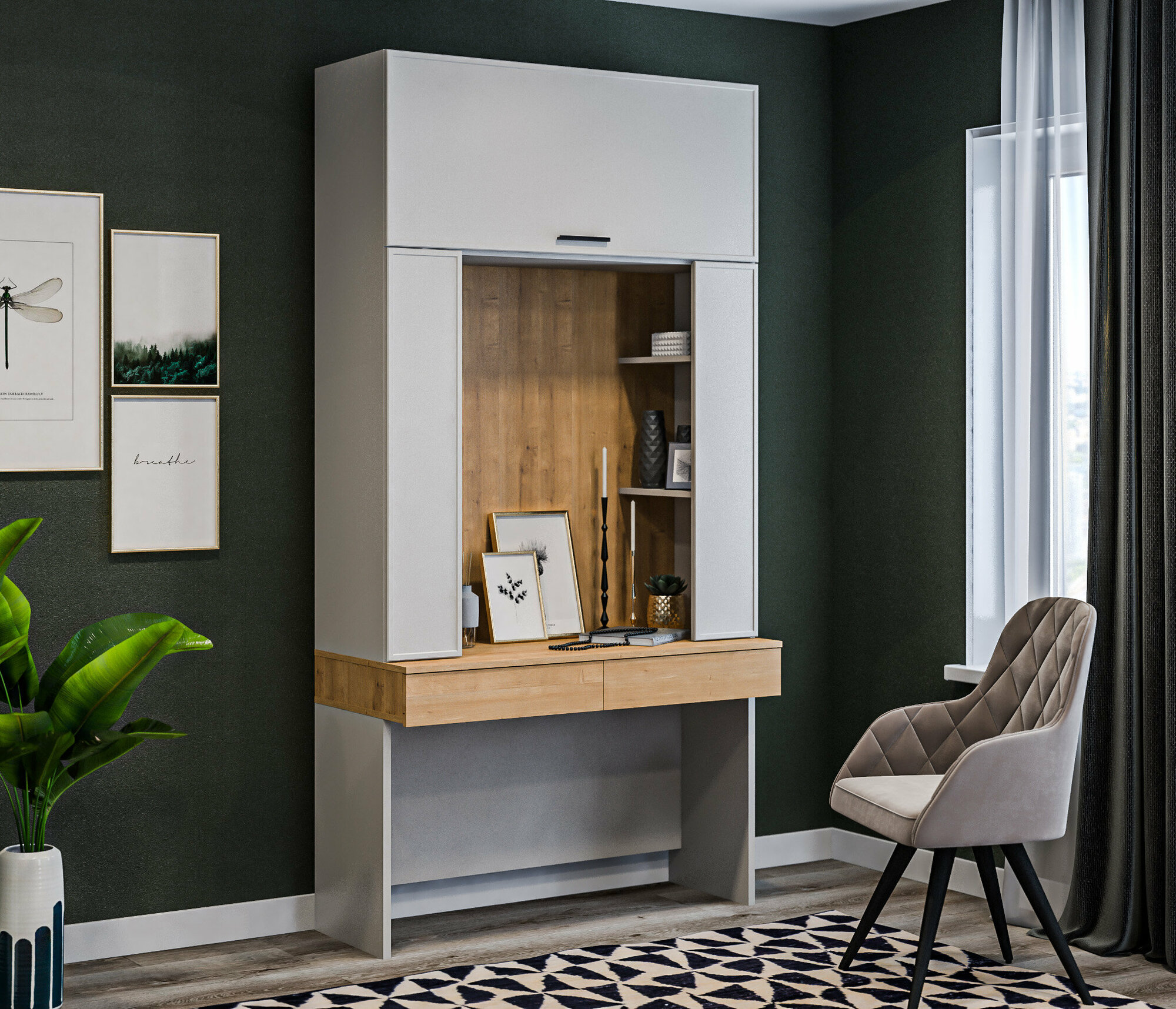 Стол с надстройкой столплит Милан СБ-3267/1 с полками, с 2 ящиками, с 1 закрытой секцией, Серый, Дуб Гамильтон/Светло-серый 118х230х50 см интересное: