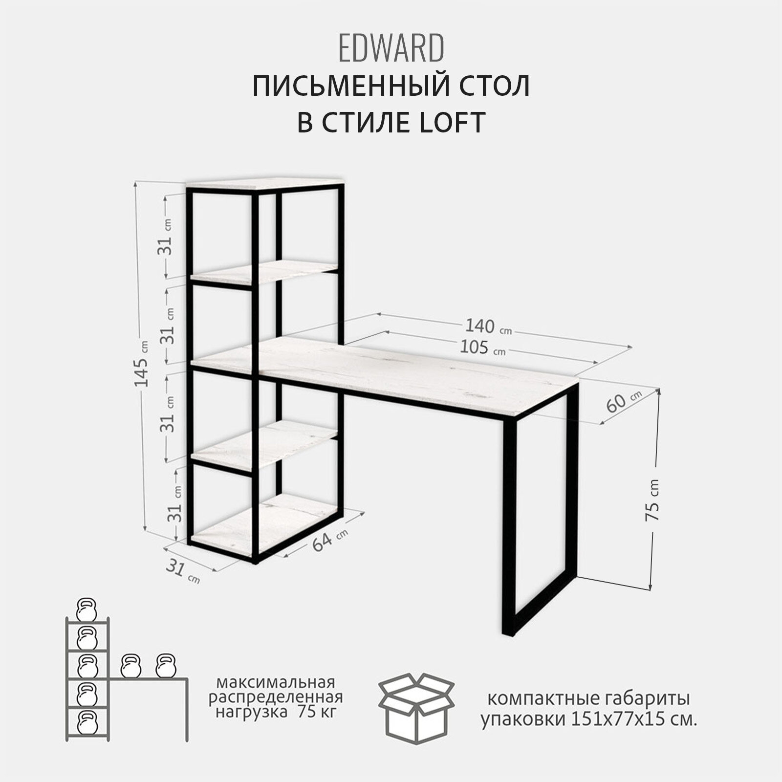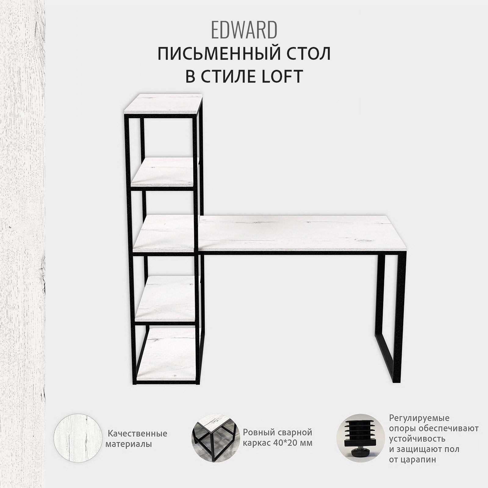 Стол письменный EDWARD loft, белый, компьютерный, офисный, 140x60x75 см, гростат