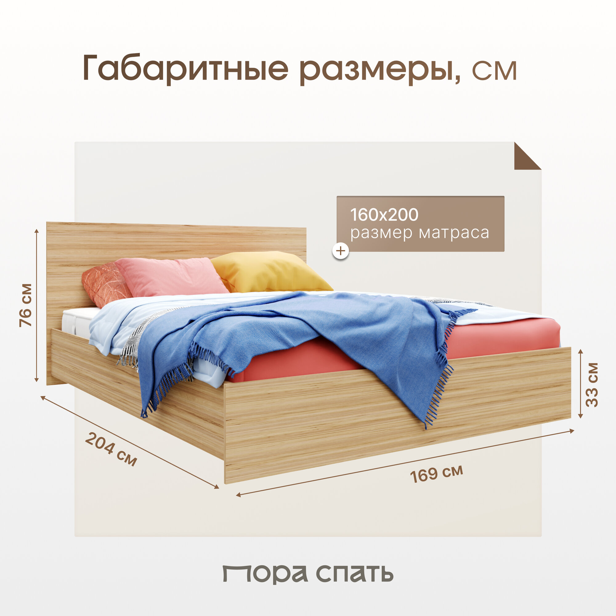 Купить Кровать двуспальная Пора Спать Амелина с основанием ДСП, Дуб Крафт спальное место: 200х160 см, габариты: 204х169 см