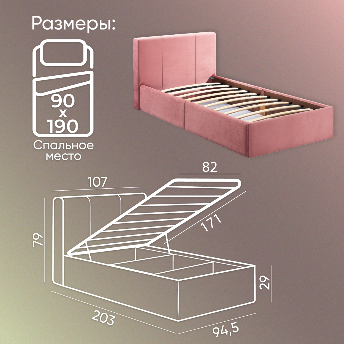 Односпальная кровать детская 90х190 см Марсель, подростковая с подъемным механизмом, вельвет розовый, Ами Мебель