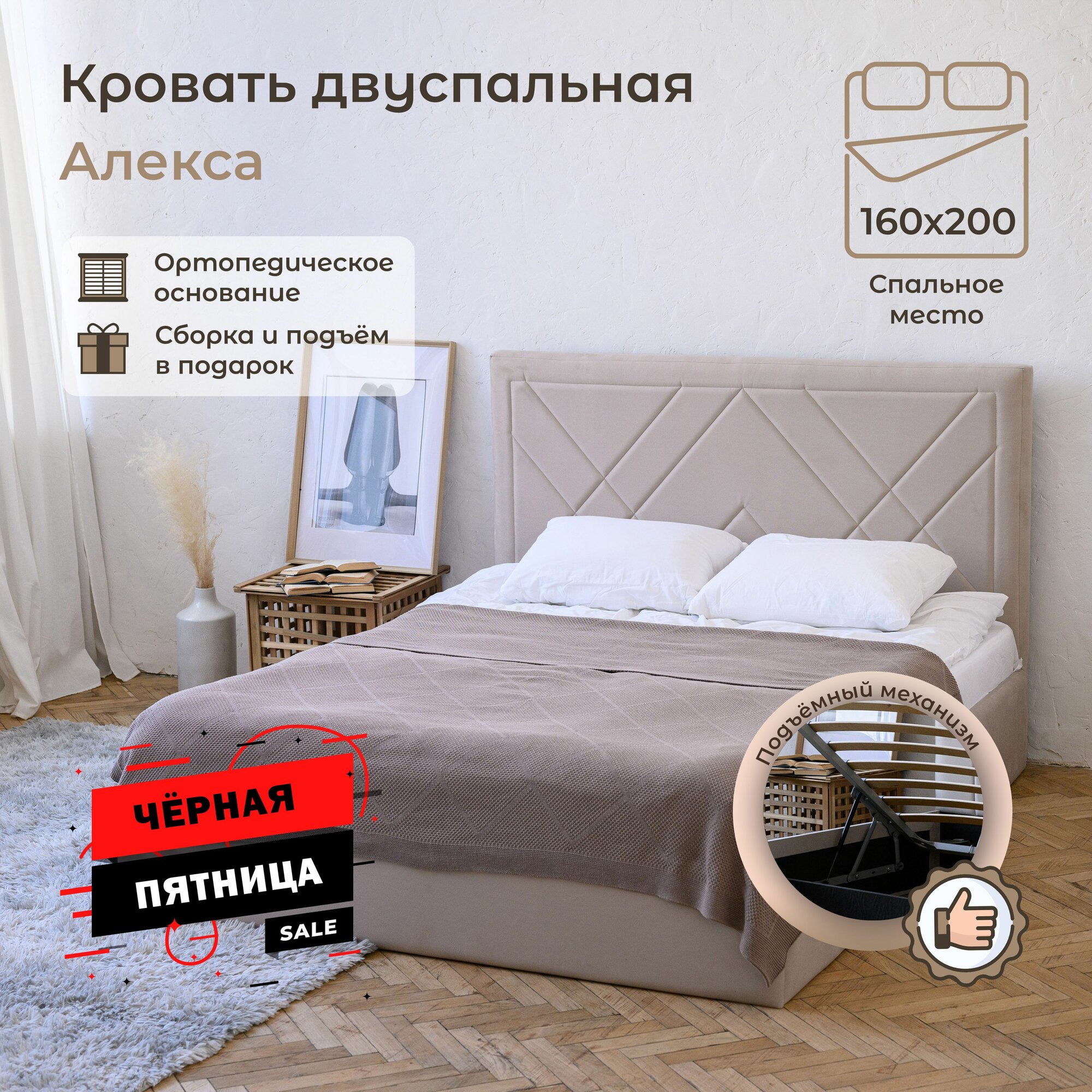 Кровать 160х200 двуспальная Алекса, с подъёмным механизмом, с ящиками, с мягким изголовьем, бежевая