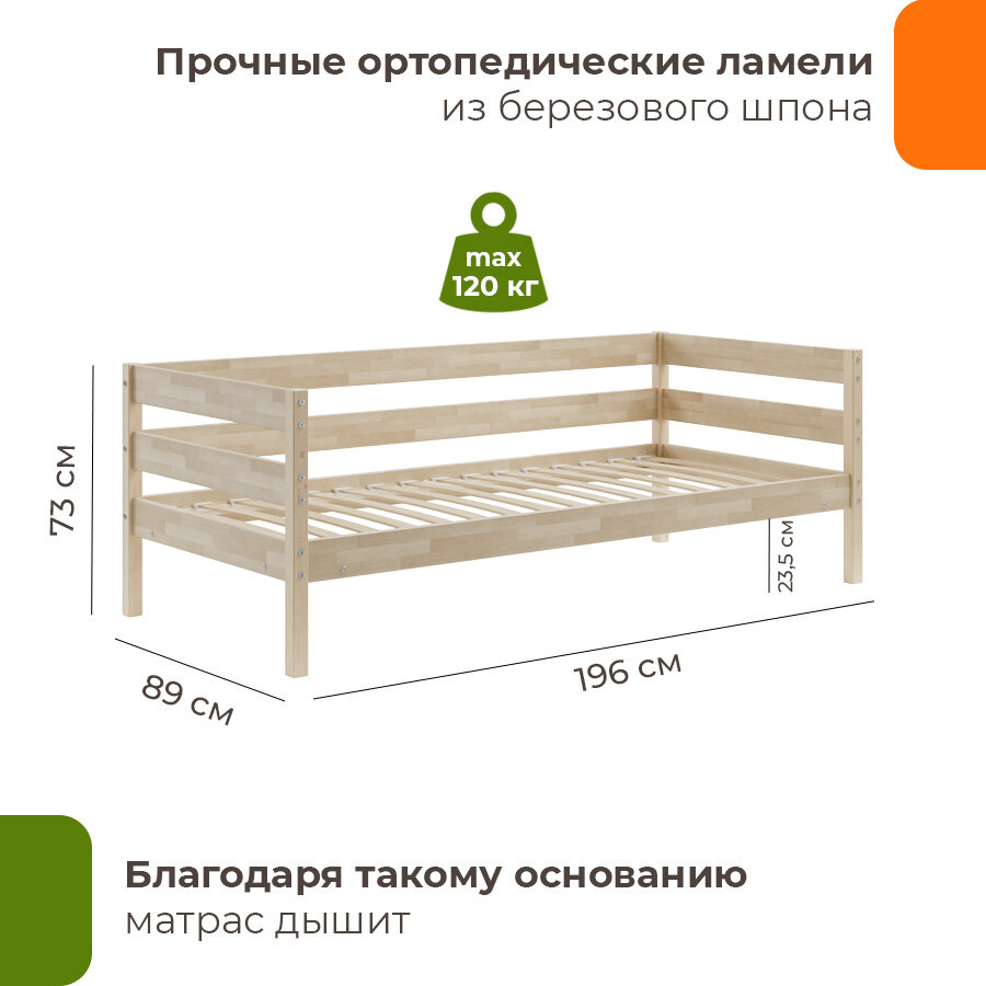 Кровать-тахта "ДомаКлёво Мечта" 90*200, массив берёзы, без обработки, высота изголовья 73 см