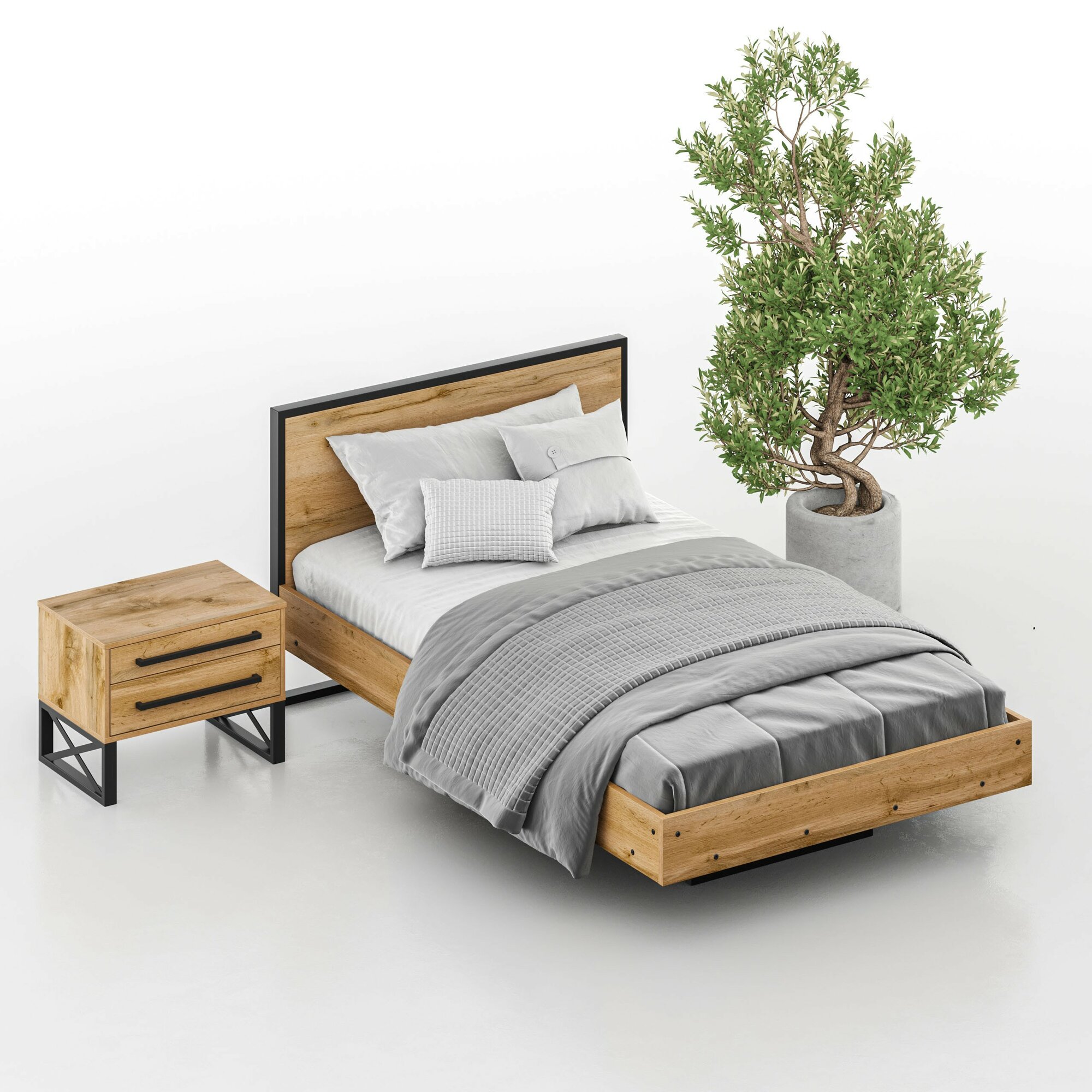 Кровать с ящиками 1800 с двумя тумбочками Камелия, цвет дуб сонома, ШхГхВ 296х217х78,2 см, спальное место 1800х2000 мм, без матраса, основание есть