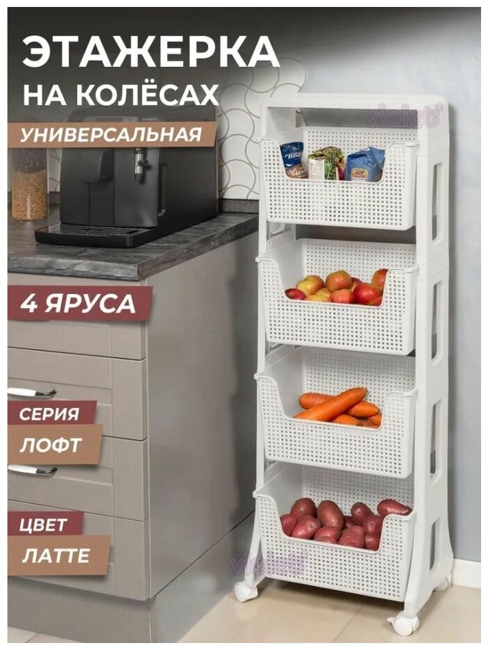 Этажерка на колесиках Лофт 4 яруса, цвет латте / напольный органайзер для хранения на кухне, в ванной