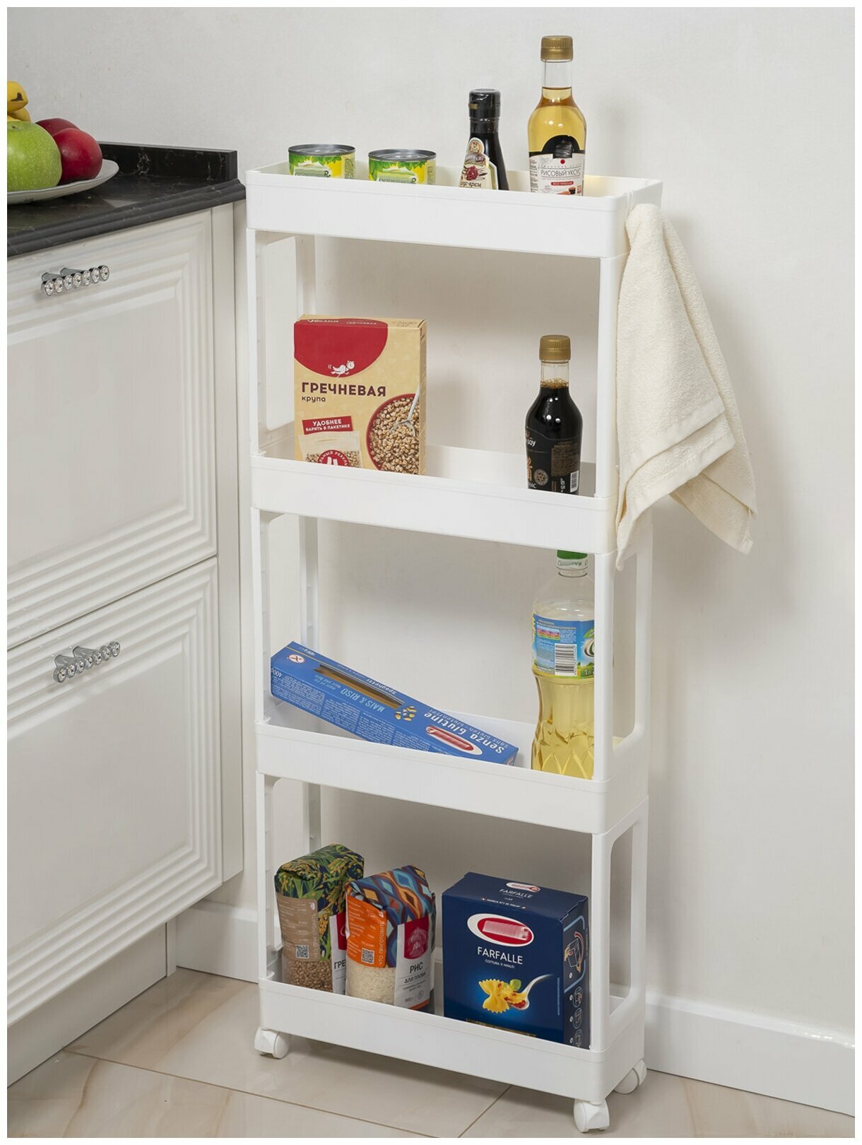 Белый стеллаж-этажерка для кухни, ванной на колесиках, 4 полки