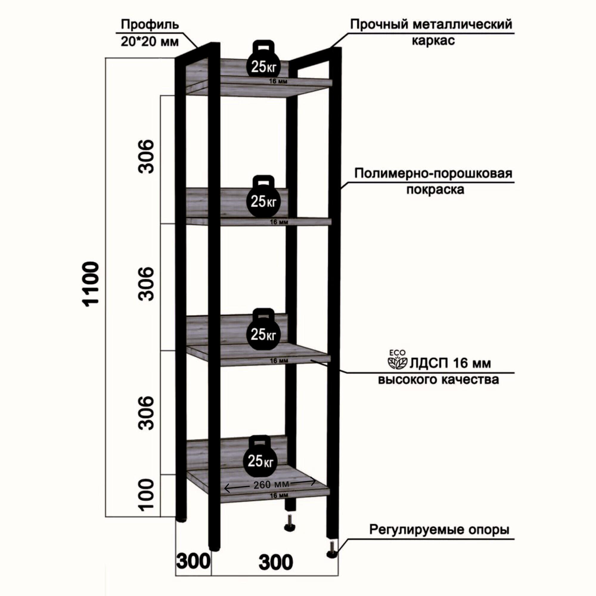 Стеллаж для кухни и гостиной в стиле лофт , 4 полки, глубина 30 см, высота 110 из ЛДСП и металла