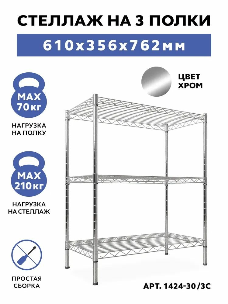 Стеллаж металлический напольный GASTRORAG 1424-30/3, 61 х 36 х 76 см, этажерка лофт с 3 полками, система хранения для балкона, лоджии, прихожей, кухни, гостиной, полка для игрушек, книг, подставка для цветов, рассады