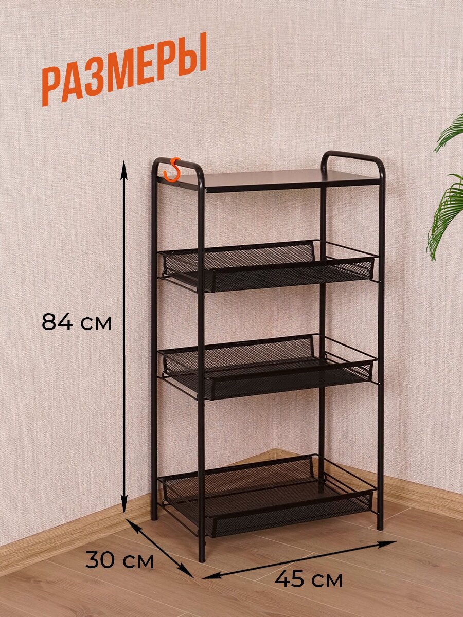 | Дополнительная информация | Этажерка имеет 3 широкие корзины и удобный металлический столик, увеличенное расстояние между нижними корзинами для высоких предметов, пластиковый крючок для мелочей |