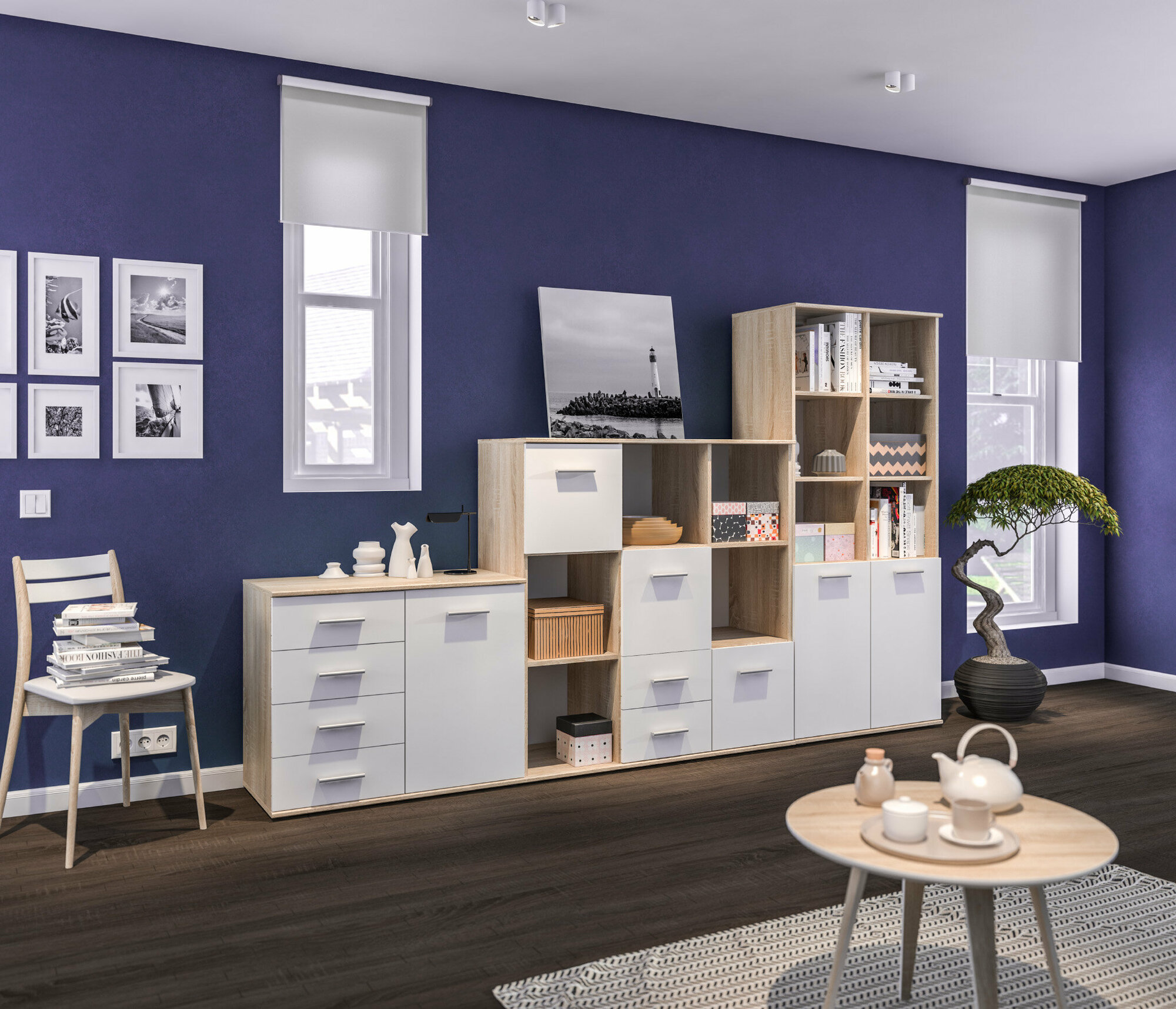 Стеллаж столплит Мамбо СБ-2794 с 5 полками, с дверцами и выдвижными ящиками, Дуб Сонома/Белый 117х121х44 см