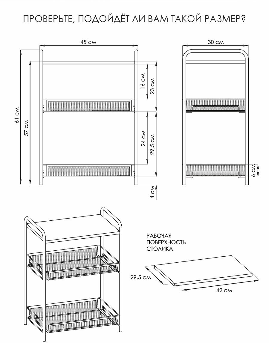 | Дополнительная информация | Допустимая нагрузка до 10 кг на корзину, пластиковый крючок для мелочей, увеличенное расстояние между нижними корзинами для высоких предметов |