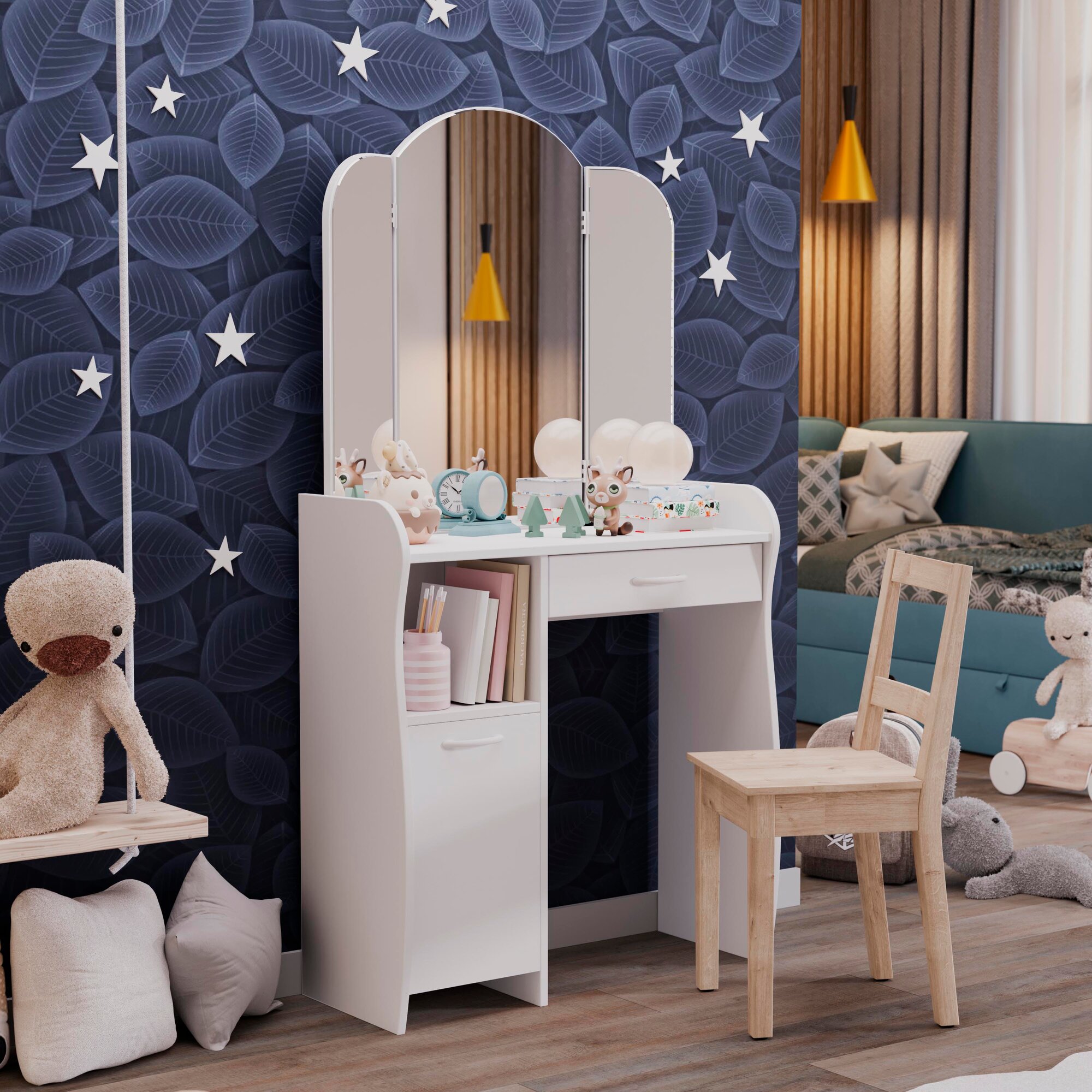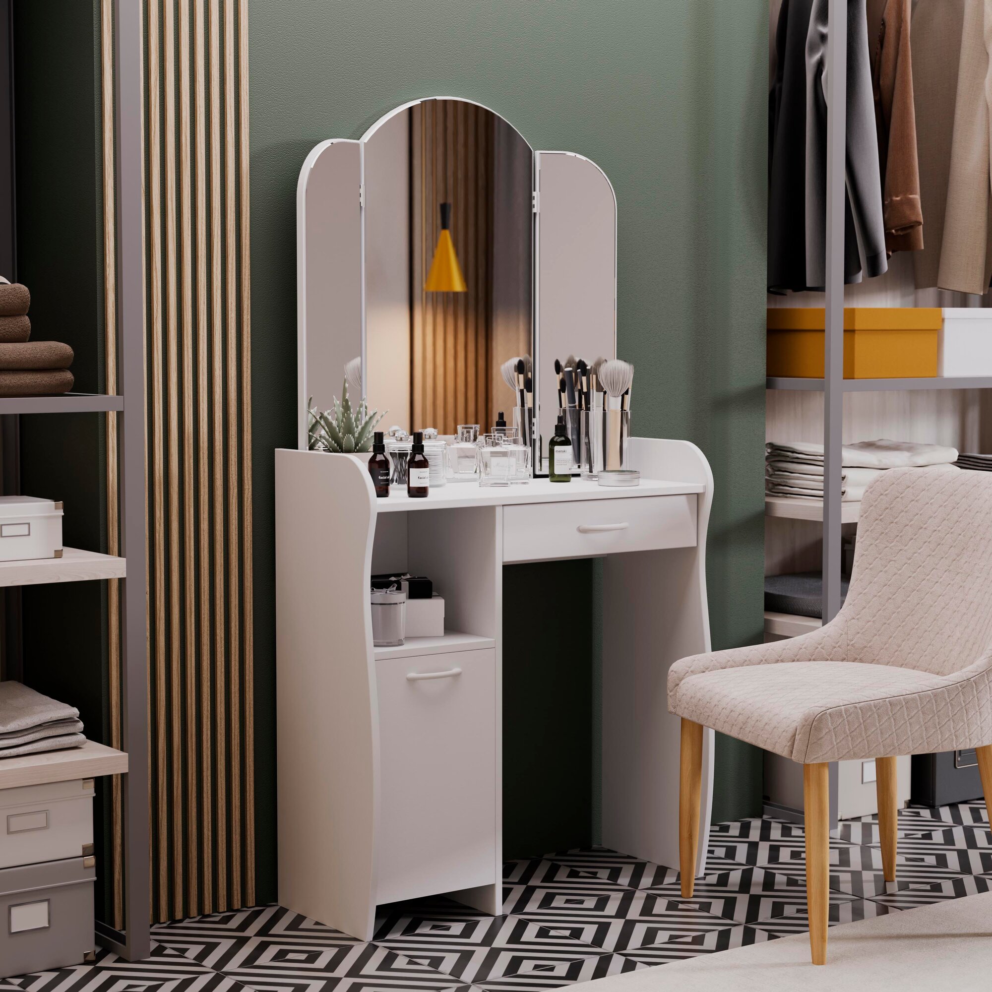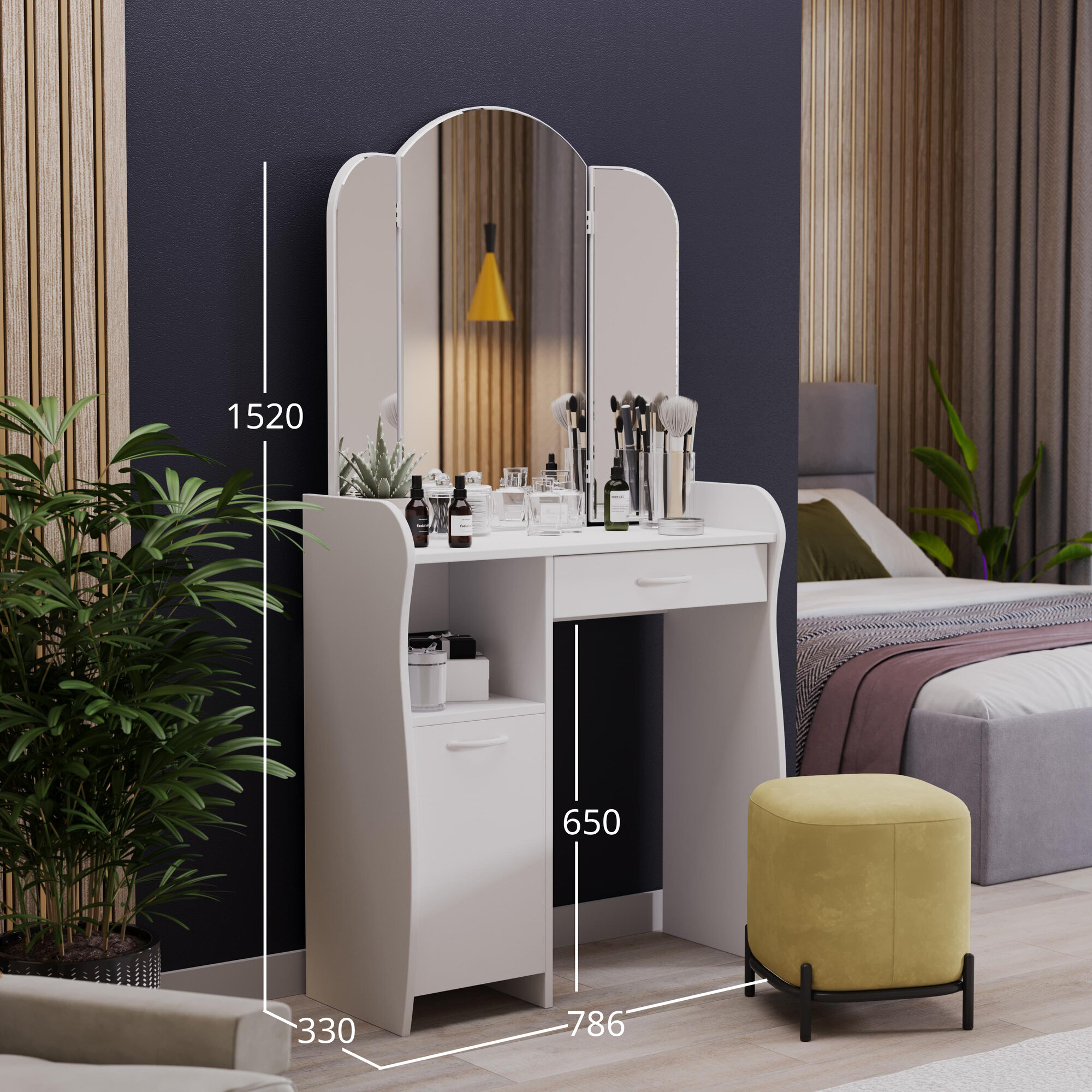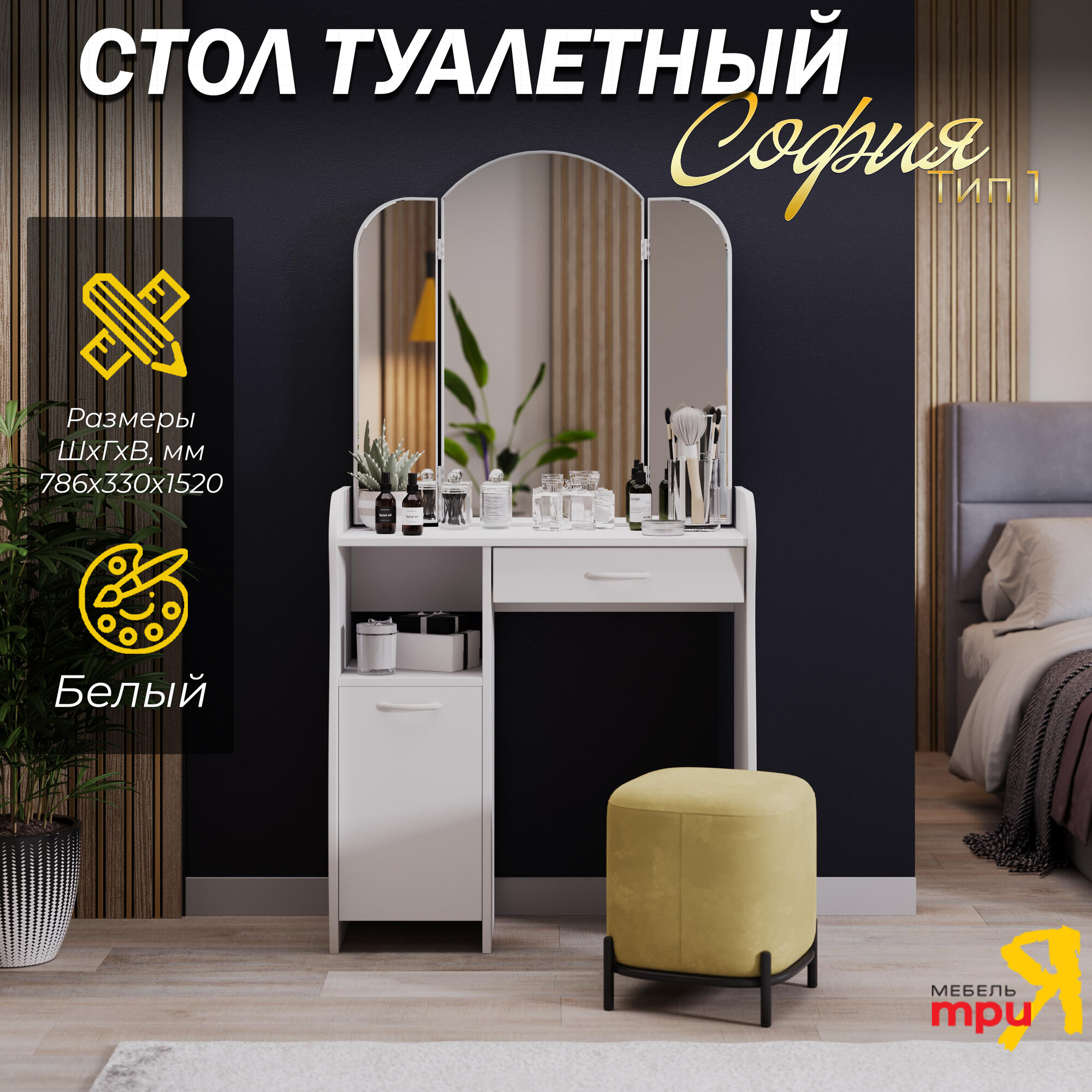 Туалетный столик, трюмо, гримерный столик с ящиком и полками белый (ВхДхГ) 152х79х33, София Т1 интересное: