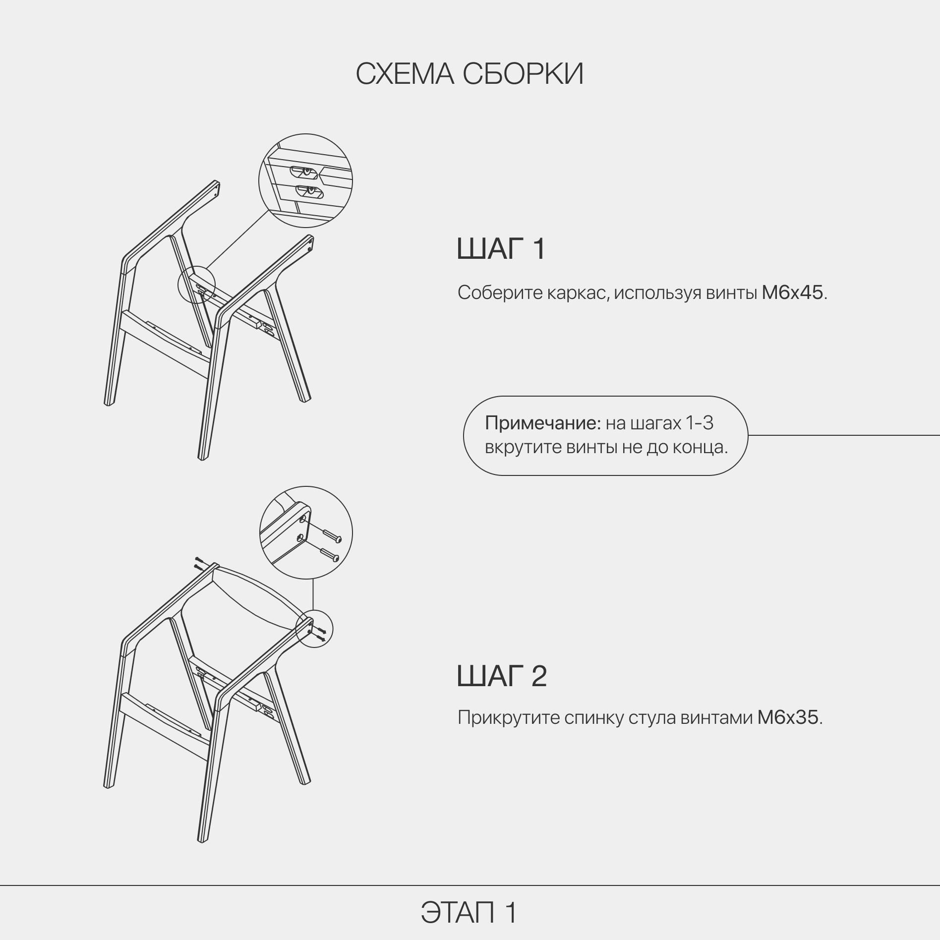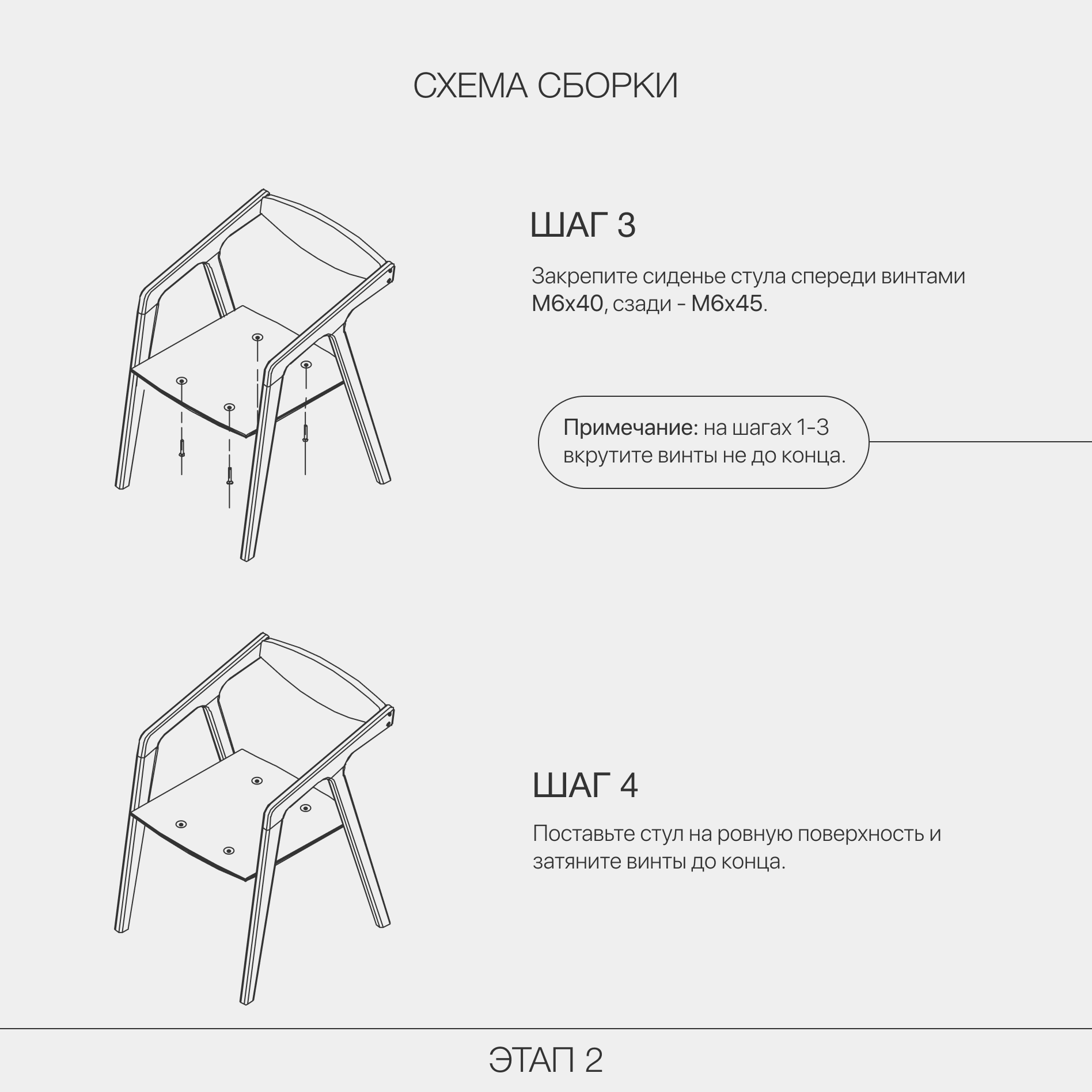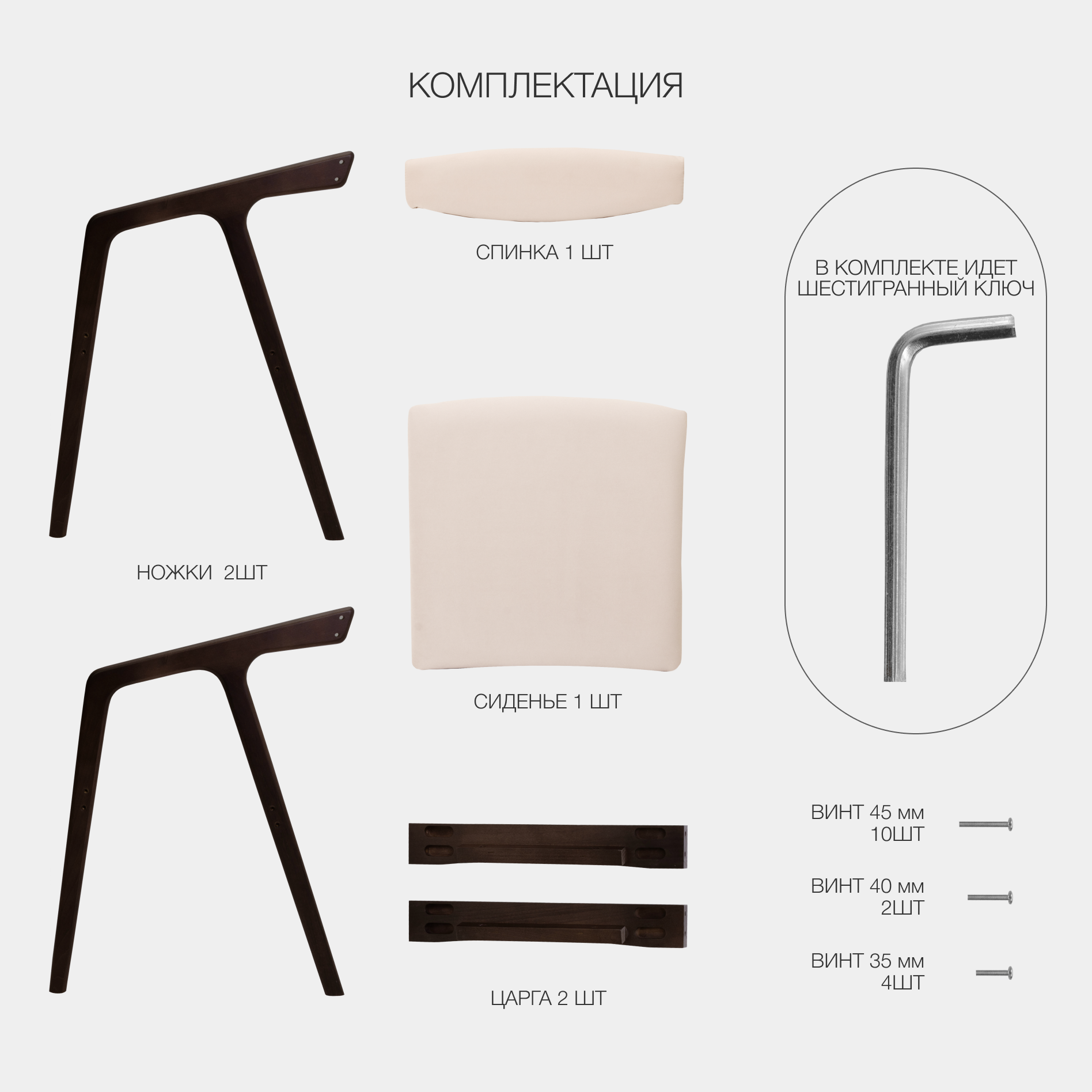 | Комплектация | Упаковка гофрокороб – 1 шт., боковины - 2 шт., царга - 2 шт., сидение - 1 шт., спинка - 1 шт., накладки на ножки - 4 шт., винт M6×45 - 10 шт., гроверная шайба - 8 шт., винт M6×40 - 2 шт., винт - M6×35 - 4 шт., ключ шестигр. - 1 шт. |