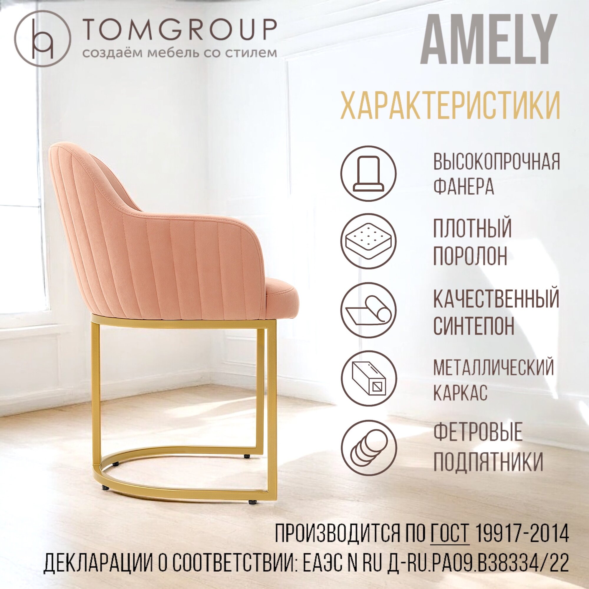 Стул TOMGROUP Amely Gray/Gold, подлокотники, ГОСТ, золотой каркас, серый велюр — дом, офис