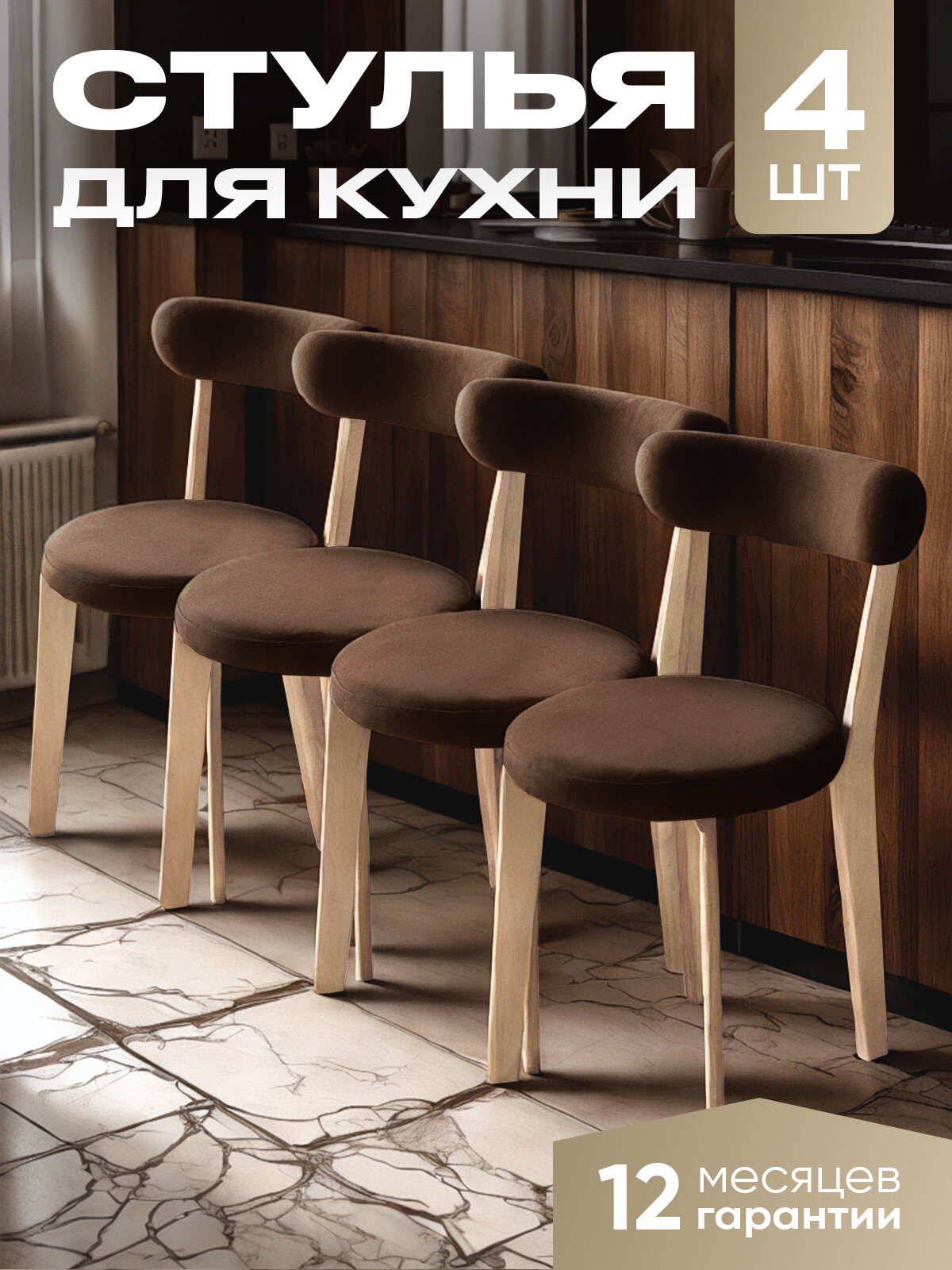 Стулья для кухни 4 шт мягкие со спинкой для дома дуб + коричневый