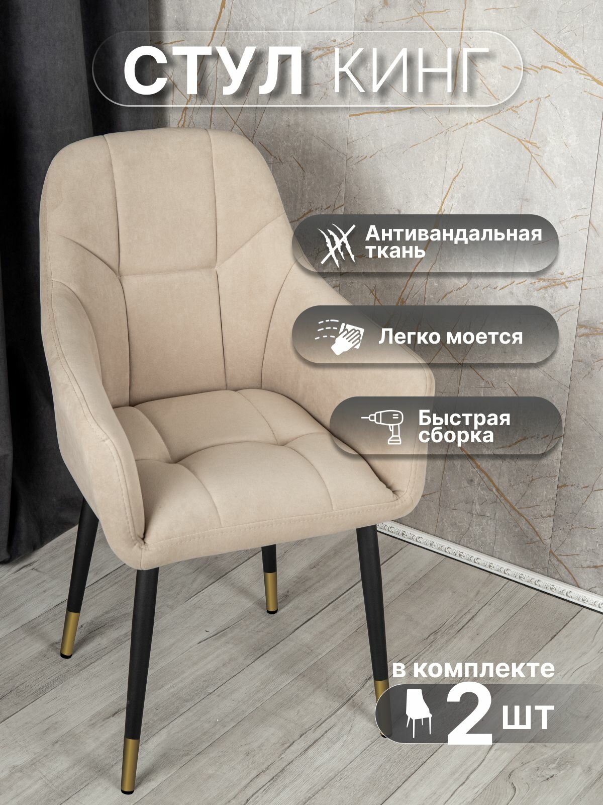 Стулья для кухни со спинкой 2 шт «Кинг», У Стулыча, антивандальный велюр, металлокаркас, бежевый, черные ножки