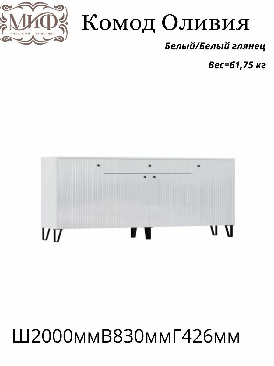 СохранитьКомод "Оливия" от бренда МиФ, модель 200x42x83, Белый /белый глянец, материал ЛДСП/МДФ, с ножками интересное: