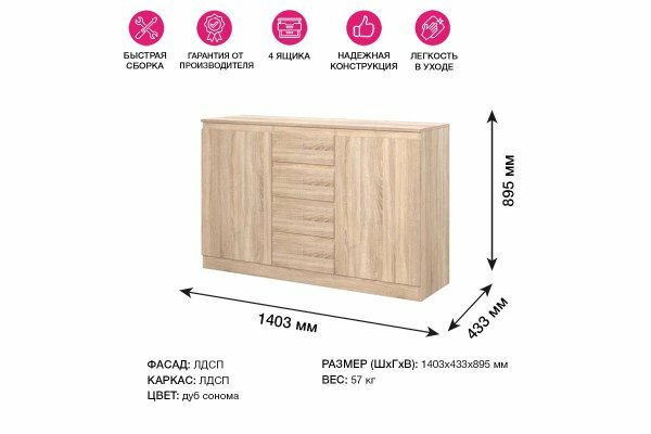 Штерн (STERN) комод Т-4, 140,3 х 89,5 х 43,3 см, 4 ящика, 2 двери, ЛДСП, Дуб Сонома