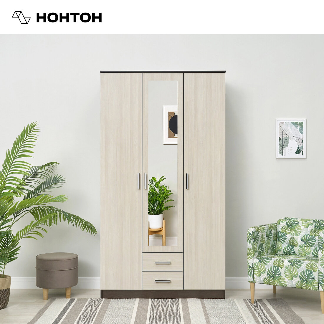 Первый Мебельный Распашной шкаф для одежды Трио с полками, с ящиками, с зеркалом, 120х49х220 см, Дуб вотан / Белый гладкий