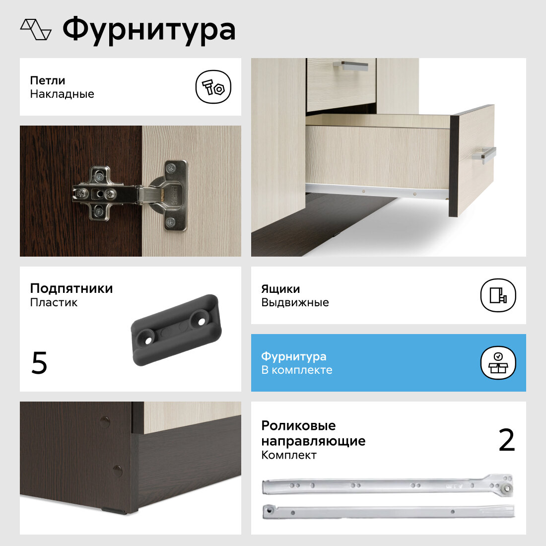 | Дополнительная информация | В комплекте имеется вся необходимая фурнитура и инструкция по сборке изделия. Монтаж зеркал к фасадам производится на фабрике. |