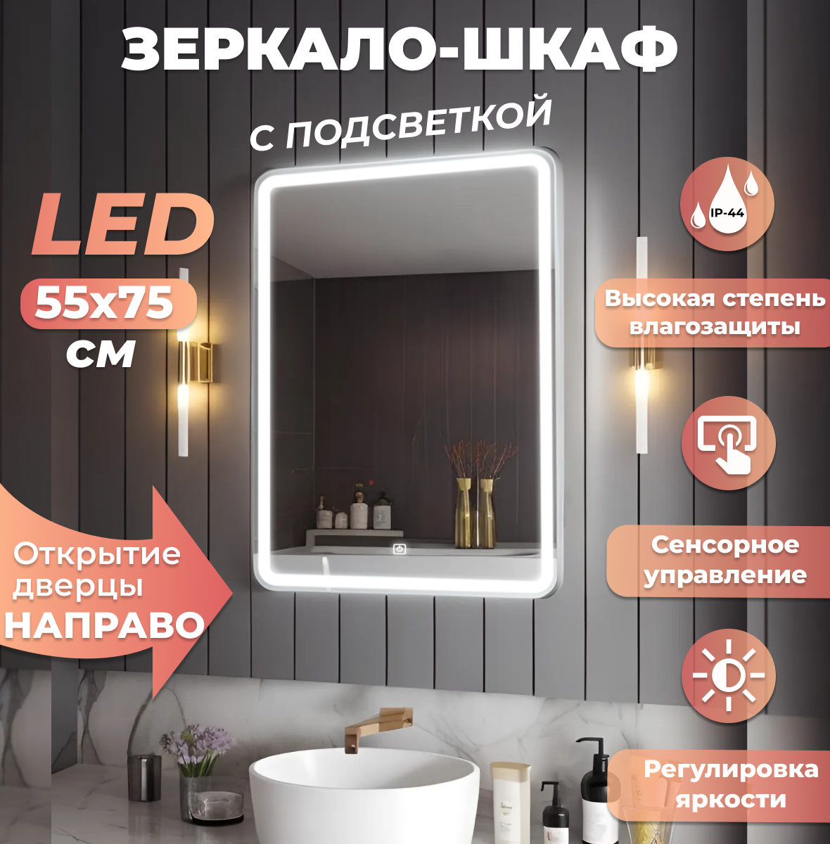 Зеркало-шкаф Мира 60 с подсветкой, 60х75х14 см
